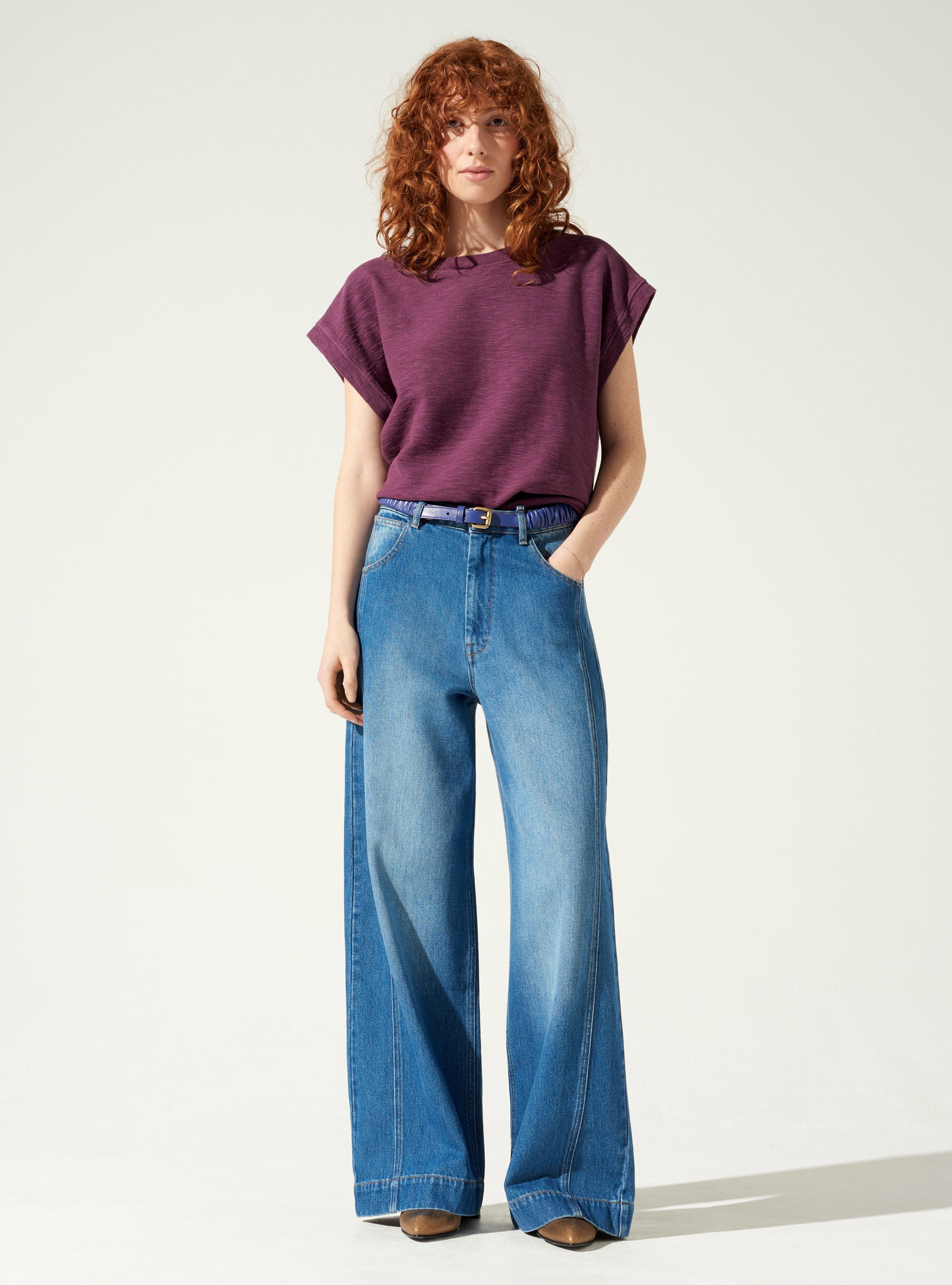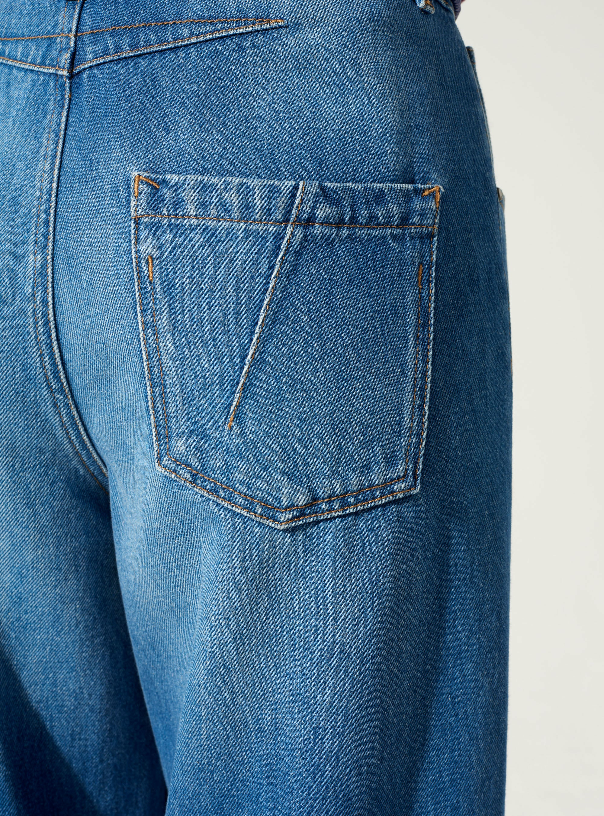 Jean large à taille haute en toile denim 100% coton avec jacron cuir au dos.
