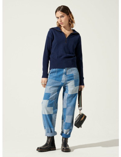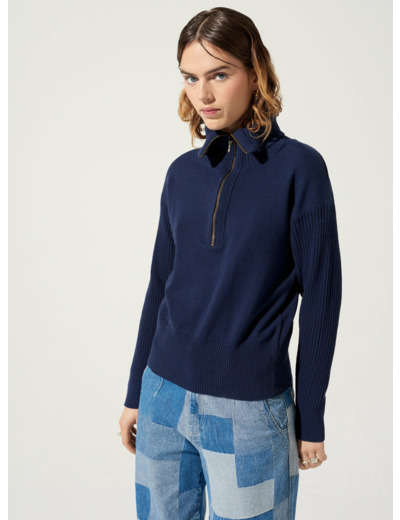 Pull au volume ajusté dont le col camionneur se termine par un zip à porter ouvert ou fermé selon les envies. Vous aimerez sa maille côtelée en matières recyclées et son jeu de tricotage entre maille et jersey.