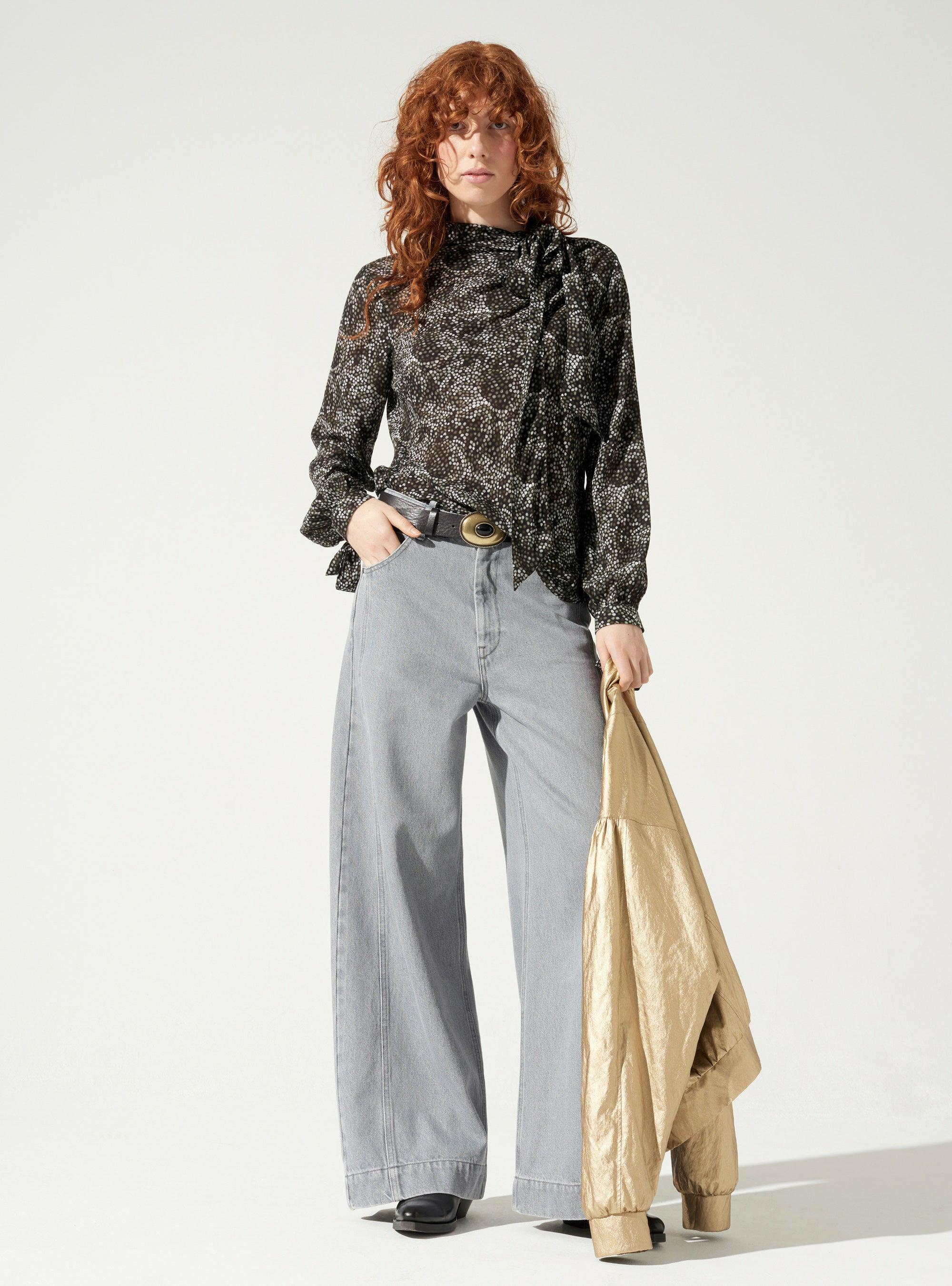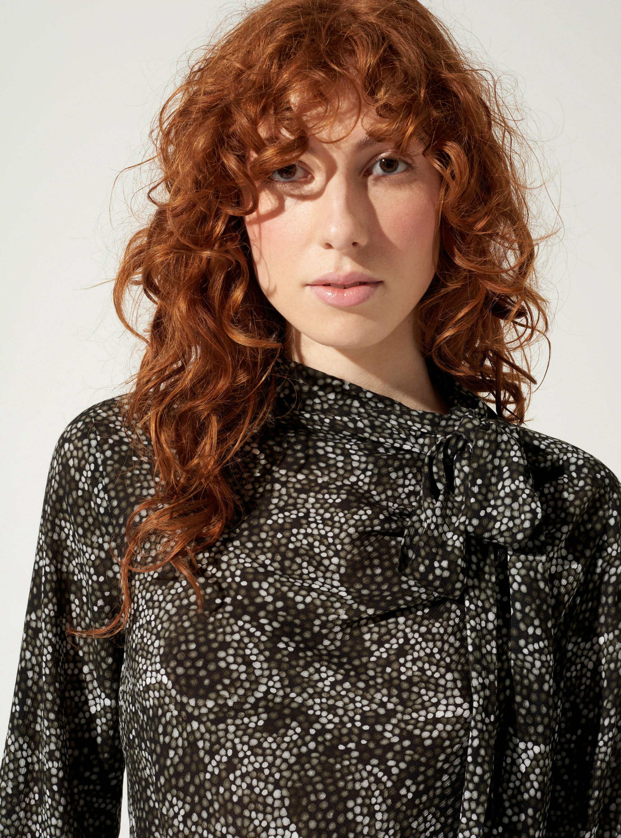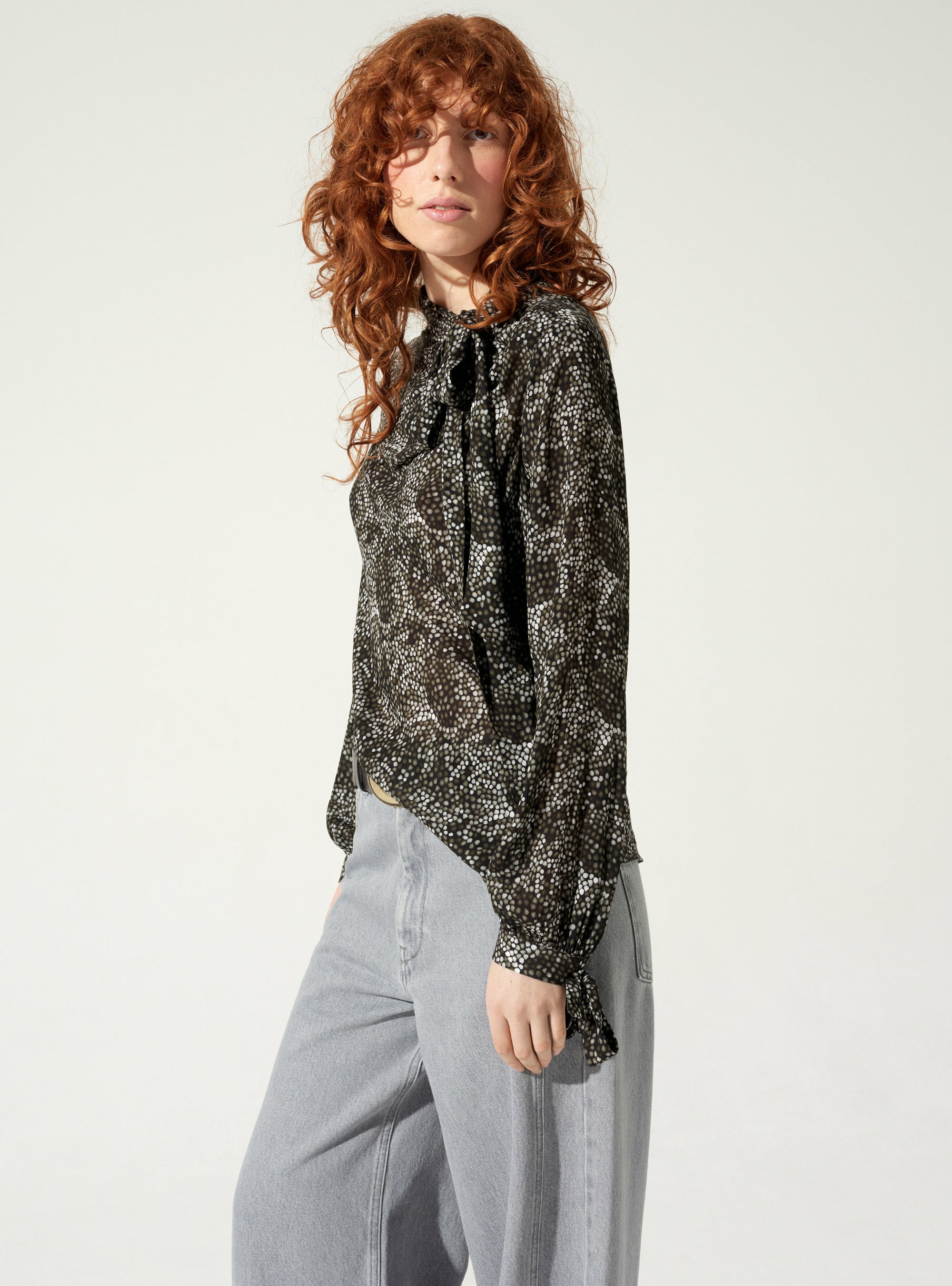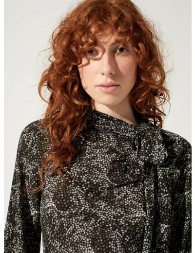 Blouse près du corps avec col montant et nœud type lavallière à nouer. Les poignets sont boutonnés et également agrémentés de nœuds amovibles. Forme légèrement arrondie dans le bas de la pièce et ouverture au niveau de l'épaule gauche à l'aide de petites pressions posées à la main. Matière fluide et douce imprimée d'un dessin Maison élaboré par notre Bureau de style.