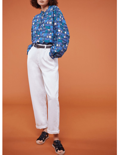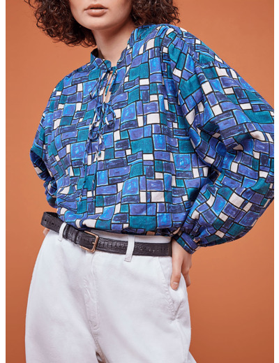 - Imprimé exclusif "Cyclades"- Tissu italien- Volume ample - Manches longues et bouffantes- Encolure ouverte avec liens à nouer- Boutons en nacre naturelle