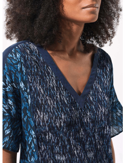 Tout le savoir-faire Cotelac se retrouve dans cette blouse plissée écrasée et bouillonnée* par nos artisans et au motif dessiné par notre bureau de syle- Petite blouse courte carrée- Encolure V- Empiècements en coton sur les côtés- Parties bouillonnées milieu devant et milieu dos soulignées par de petites bandes unies- Manches courtes légèrement volantées couvrant le haut du bras- Empiècements épaules et bande d'encolure contrastants(volume ajusté)