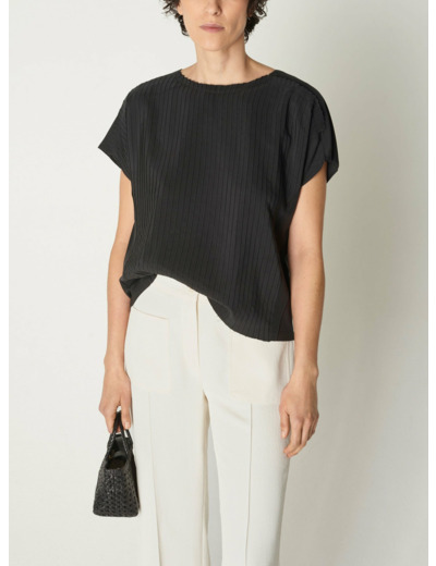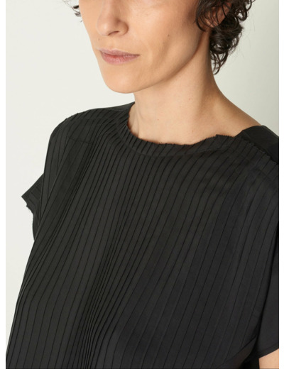 Cette blouse à manches courtes présente une encolure ronde pour un look classique et polyvalent. Un empiècement plissé devant ajoute de la texture et de la dimension à la pièce. L'appliqué plissé est libre au niveau de l'encolure et des épaules. À l'arrière, une goutte est fermée par un bouton en nacre naturelle. Savoir-faire : procédé de plissage et d'écrasement réalisé dans notre atelier d'Ambérieu en Bugey.Marque : Cotélac