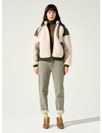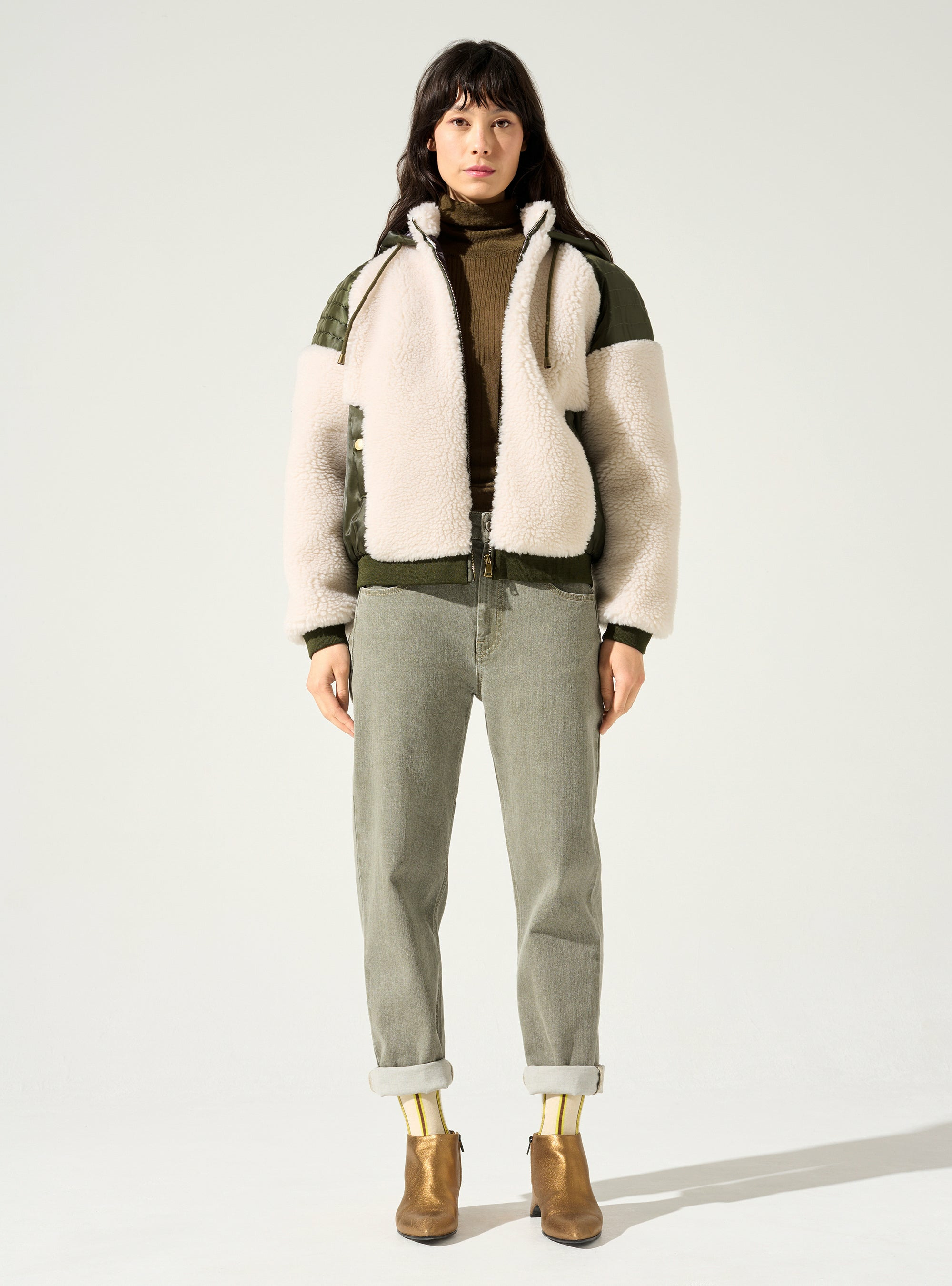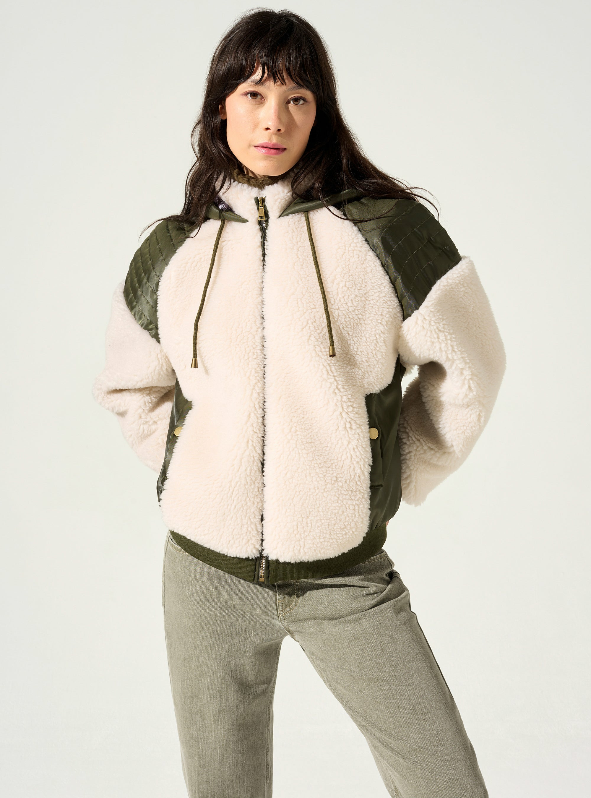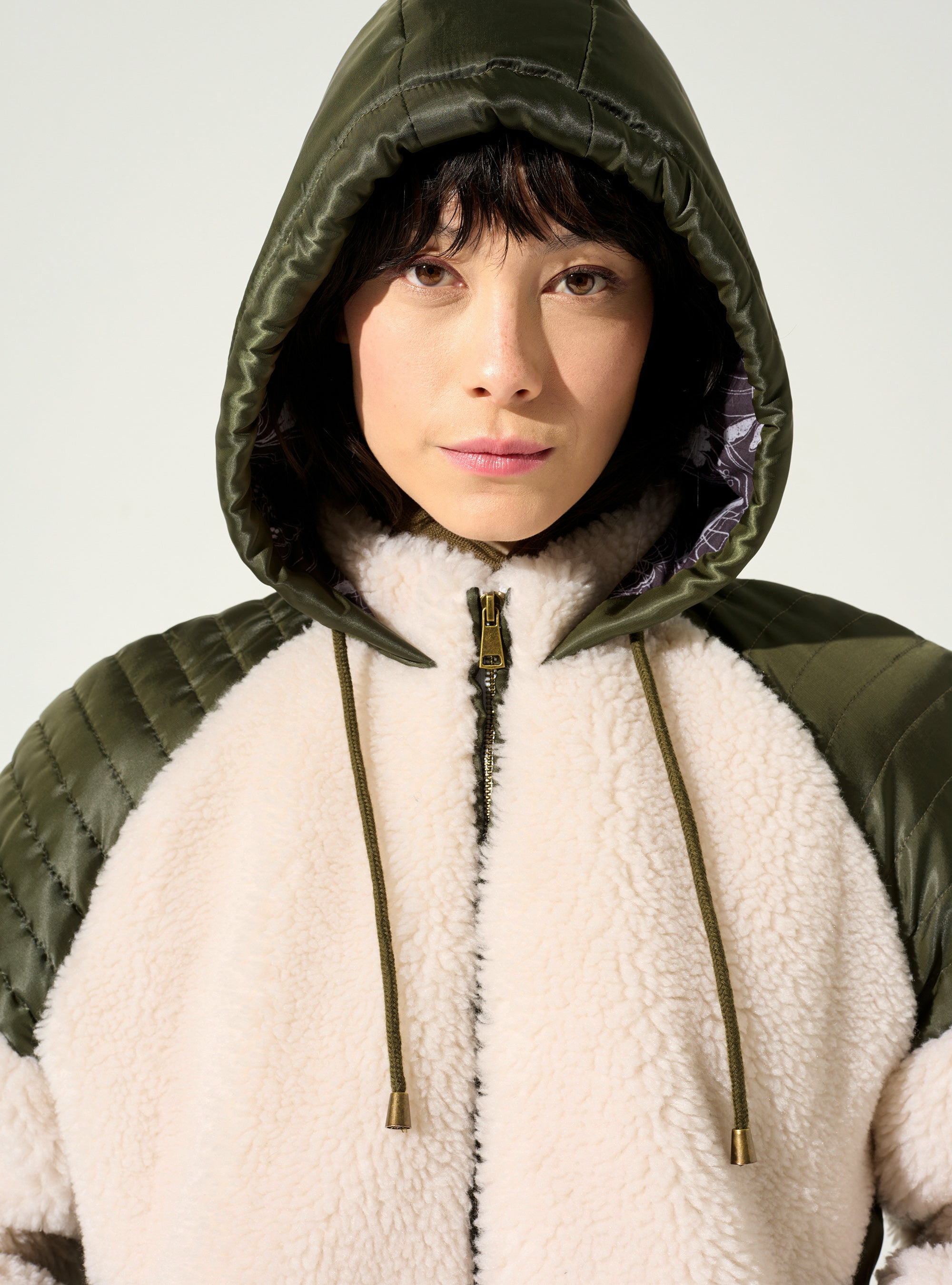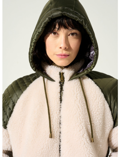 Blouson à capuche esprit streetwear avec son zip en métal et ses bas de manches et bas de buste resserrés par un bord côtes. Mélange de matières ultra-chaudes et douces, à la fois technique matelassée et sherpa. Doublure coton imprimée avec le dessin de la saison.