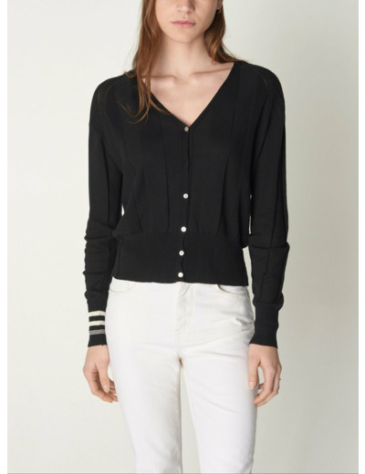 Cardigan à manches longues avec encolure en V : une pièce incontournable et intemporelle avec son tricotage graphique dévoilant de larges rayures. Il se distingue par ses détails de points fantaisies, signature de la maison, ainsi que son boutonnage en nacre naturelle. Il se porte boutonné pour un look casual ou sur une robe pour les longues soirées d'été.