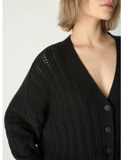 Cardigan à manches longues avec encolure en V : une pièce basique et intemporelle avec sa maille ajourée et son mélange de points fantaisie, signature de la maison. Il se distingue par son volume ample resserré au niveau des hanches et son boutonnage devant en corozo. Il se porte boutonné pour un look casual ou sur une robe pour les longues soirées d'été.Marque : Cotélac