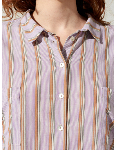 Chemise ample au col officier légèrement montant. Style renforcé par les poches plaquées à rabats et les poignets boutonnés en nacre naturelle ton sur ton. Vous aimerez le détail de découpe et de pli creux dans le dos. Matière grattée douce et chaude, très agréable à porter en hiver.