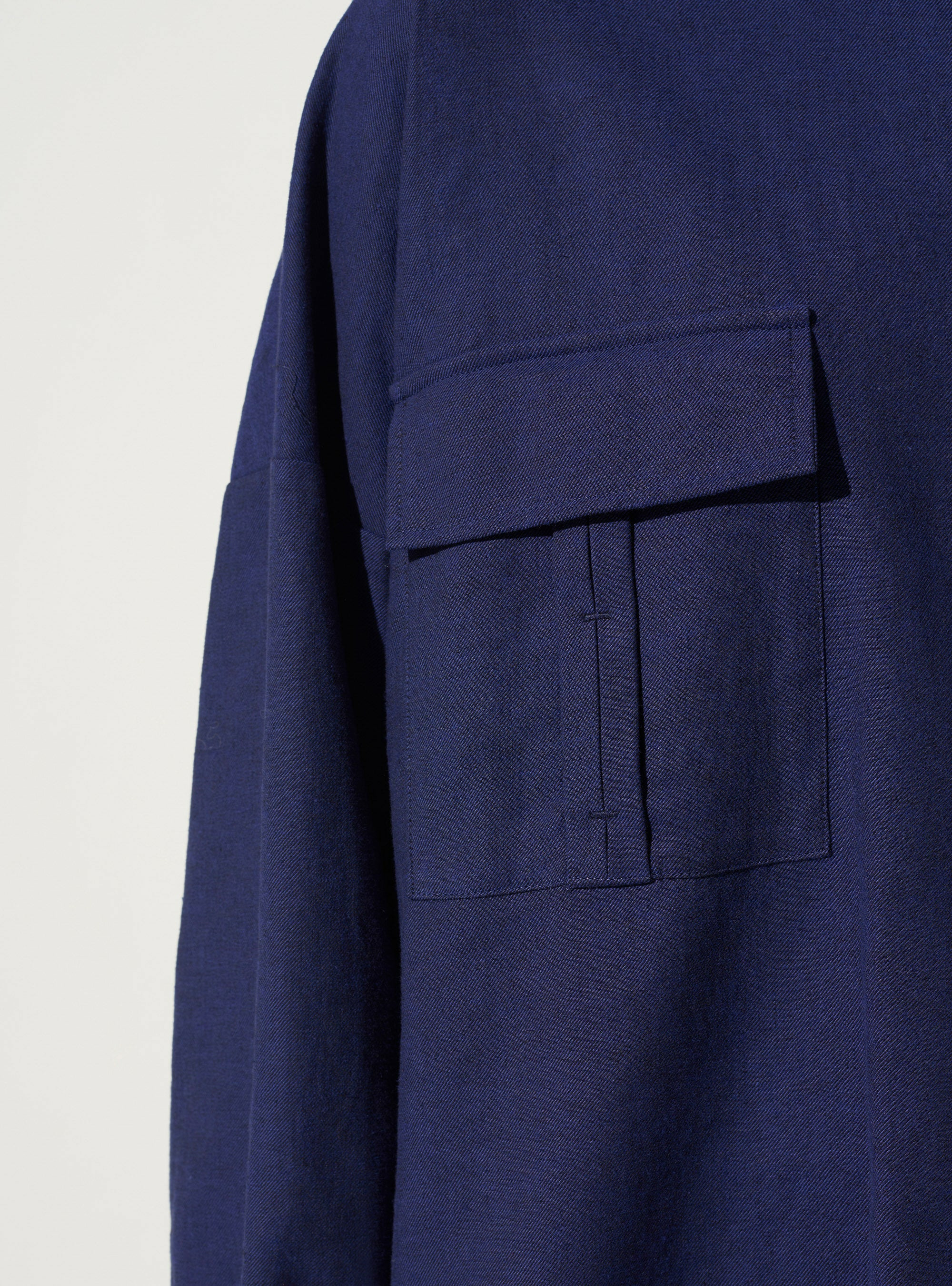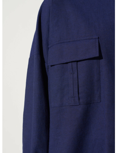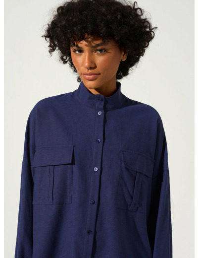 Chemise ample au col officier légèrement montant. Style renforcé par les poches plaquées à rabats et les poignets boutonnés en nacre naturelle ton sur ton. Vous aimerez le détail de découpe et de pli creux dans le dos. Matière grattée douce et chaude, très agréable à porter en hiver.