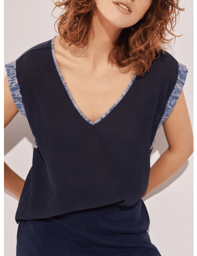 Débardeur plissé bouilloné et sublimé* par nos artisans près de Lyon- Débardeur volume court carré - Encolure profonde en V devant et dos- Bas du corps bord franc.(volume droit)