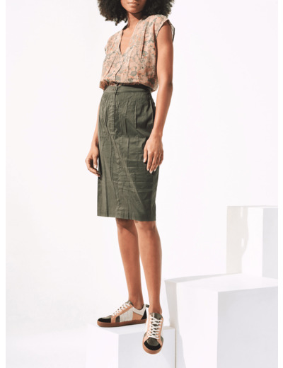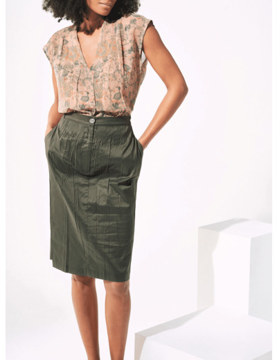 La jupe crayon basique revisitée dans le savoir-faire Cotelac- Jupe crayon- Longueur genoux- Braguette avec zip caché milieu devant- Ceinture boutonnée avec passants- Poches côtés - Plissé cristal sous ceinture devant- Poches passepoilées dos- Empiècement plissé cristal dos en pointe- Fente mileu dos- Taille haute
