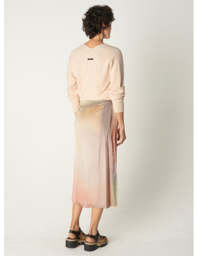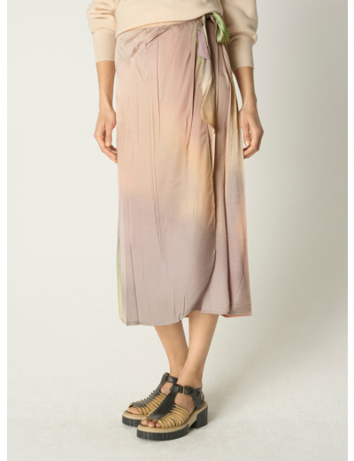 Cette jupe longue incarne une élégance intemporelle avec son esprit pareo, sa taille haute et son ouverture nouée. Les pinces dans le dos ainsi que la découpe arrondie en bas de corps structurent la pièce. La matière principale est en polyester et le dos est doublé de viscose, avec l'imprimé "Calling you" exclusif. La finition type écrasement est la signature de la maison.
