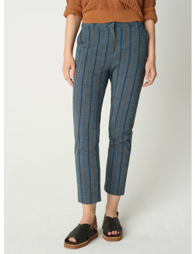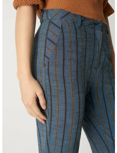 Pantalon à rayures, qui allie confort et style inspiré du denim. Sa coupe droite taille haute et sa longueur 7/8 en font un choix intemporel au charme faussement classique. Les irrégularités de son tissage lui confèrent un aspect brut unique.Marque : Cotélac
