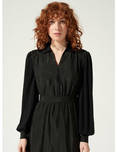 Robe longue ajustée à la taille par une découpe ceinturée, dont la jupe est bordée par un volant dans le bas et à l'encolure en V sur le devant. Manches longues légèrement bouffantes, resserrées aux poignets par un bouton de nacre. Zip invisible dans le dos pour un enfilage optimal. Cette robe est constituée de trois matières différentes : le jersey de laine pour son confort et sa chaleur, le cupro pour sa fluidité et son aspect légèrement satiné et enfin le polyester pour sa technicité et le raffinement de son plissage permanent.