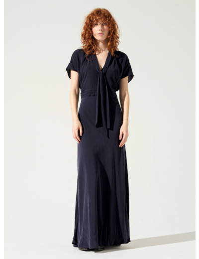 Robe longue appuyée aux hanches, grâce à une ceinture effet plissé irrégulier marquant la taille, et évasée dans le bas. Encolure fendue sur le milieu et nouée avec une lavallière. Manches courtes type papillon et emmanchures raglan très basses. Zip invisible sur le côté.