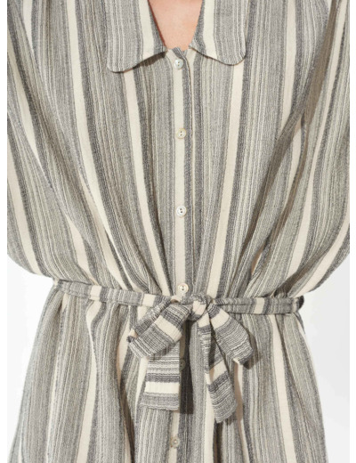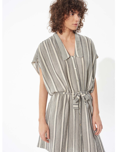 - Ceinturée à la taille avec 2 propositions de ceintures : une noire unie et l'autre rayée ton sur ton