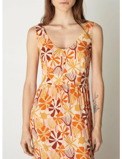 Robe fluide à la longueur maxi à encolure ronde, aux manches courtes et au volume ajusté à la poitrine. Son imprimé graphique Brava en fait la robe parfaite pour un style affirmé. Vous aimerez les fronces à la découpe sous la poitrine et les boutons en nacre naturelle.Marque : acoté