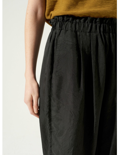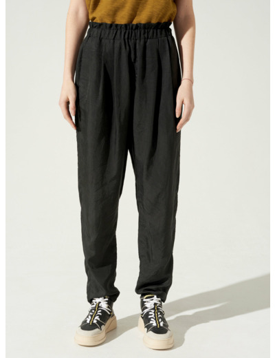 Pantalon sarouel avec fourche basse et bas de jambes fuselés. Ceinture élastiquée et froncée à la taille.