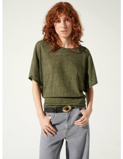T-shirt à manches courtes à l'encolure esprit bateau. Sa matière, mélange de lin flammé et de polyester, allie le confort d'une matière naturelle à la technicité du polyester. Ses emmanchures descendues offrent un confort optimal tout comme son volume ample resserré à la taille par un plissé cristal réalisé pièce par pièce dans notre atelier d'Ambérieu en Bugey.