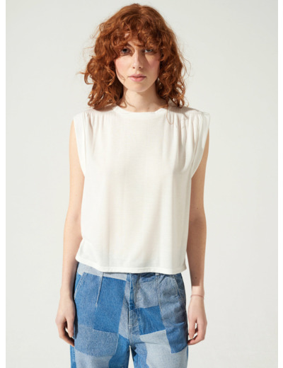 Débardeur au volume carré et à l'encolure ronde. Matière douce et confortable : la viscose lui donne toute sa fluidité tandis que le polyester nous permet de procéder au plissage du cristal. Découpe épaules et dos soulignée par un plissé cristal effectué pièce par pièce dans notre atelier d'Ambérieu en Bugey.