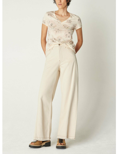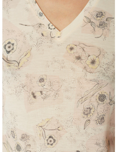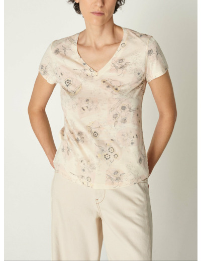 T-shirt à la coupe ajustée qui épouse les courbes du corps, mettant en valeur la silhouette. L'encolure en V est flatteuse et met en avant vos colliers. Les courtes manches ajoutent une touche décontractée au t-shirt, idéales pour les journées chaudes. C'est une pièce essentielle pour une garde-robe estivale. Procédé de sublimation réalisé par nos soins dans notre atelier d'Ambérieu en Bugey. Motif maison exclusif " Porcelaine" réalisé par notre bureau de style.Marque : Cotélac