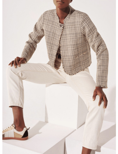 La veste en tweed revisité par le savoir-faire Cotelac- Petite veste ajustée esprit veste en tweed revisitée- Fermée par un bouton à l'encolure - Col officier - Manches longues - Pinces poitrine - Épaulettes- Couture esprit pli plat milieu dos - Poches passepoilées devant - Ourlet arrondi milieu devant et milieu dos - Finitions frangées le long des coutures ourlets et poches - Entièrement doublée du coton imprimé de la saison(volume ajusté)
