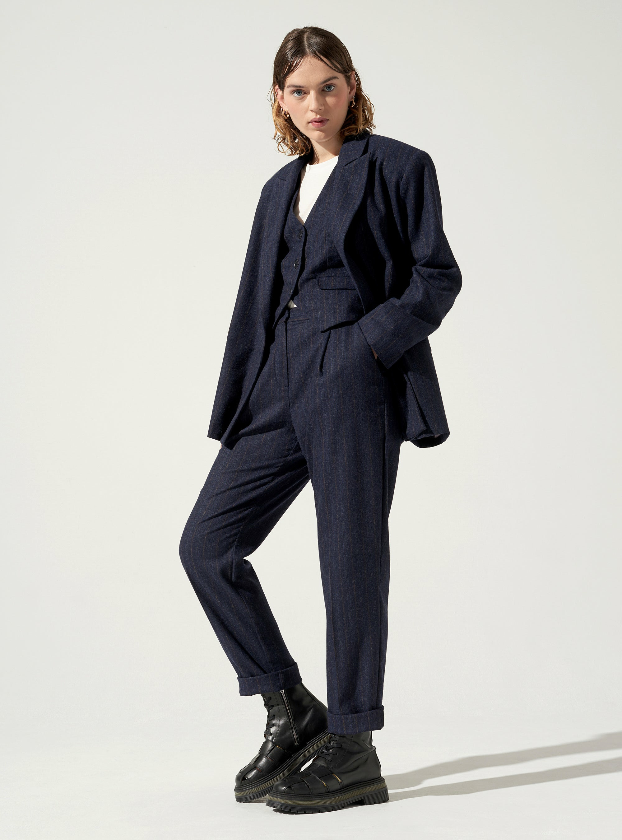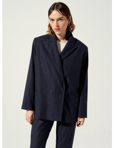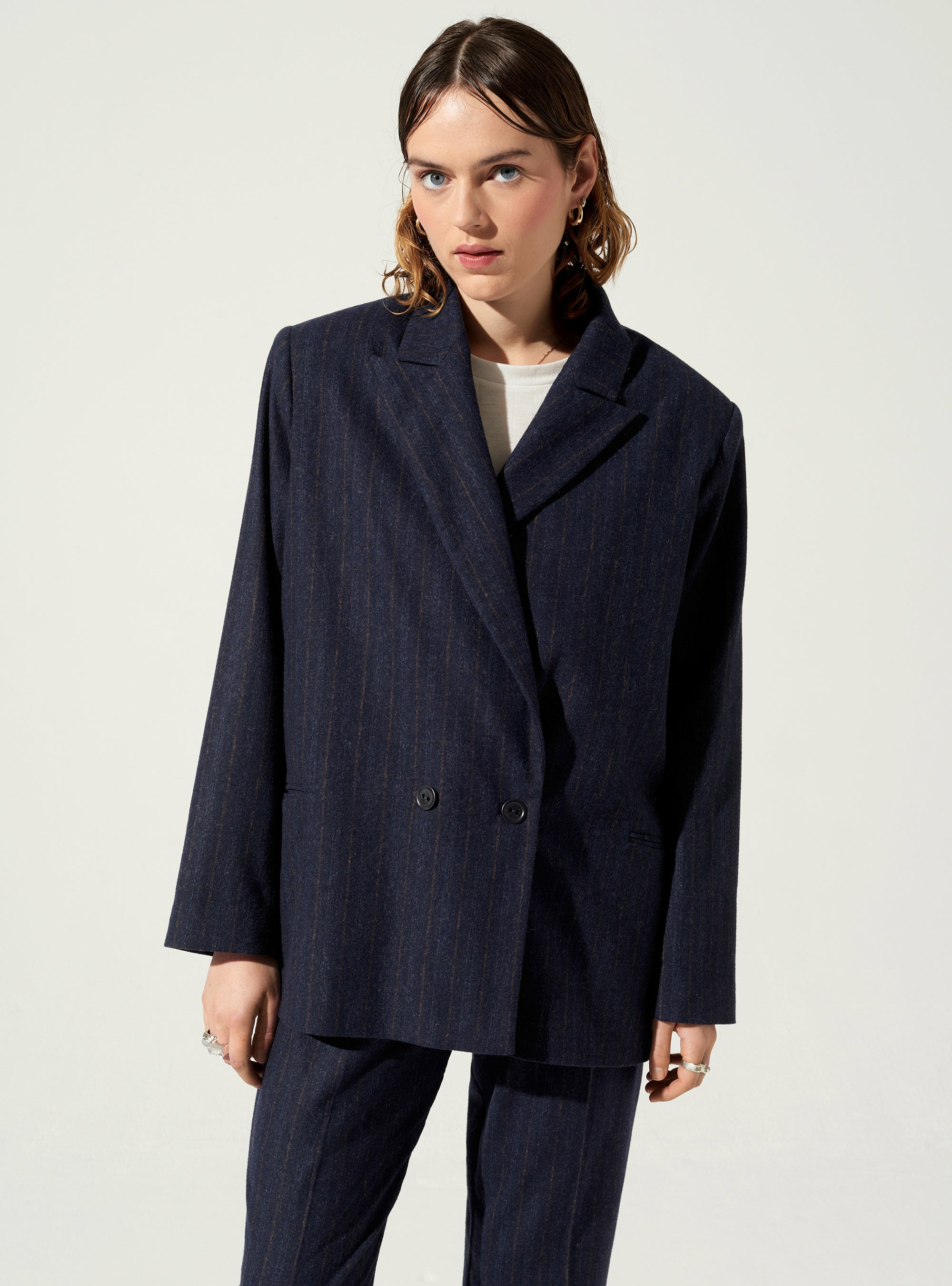 Veste de costume tailleur à col droit avec revers en pointe et épaulettes. Une pièce élégante renforcée par ses poches à rabats, sa fente dans le bas du dos et son double boutonnage en corozo ton sur ton. Doublée avec l'imprimé Maison de la saison.
