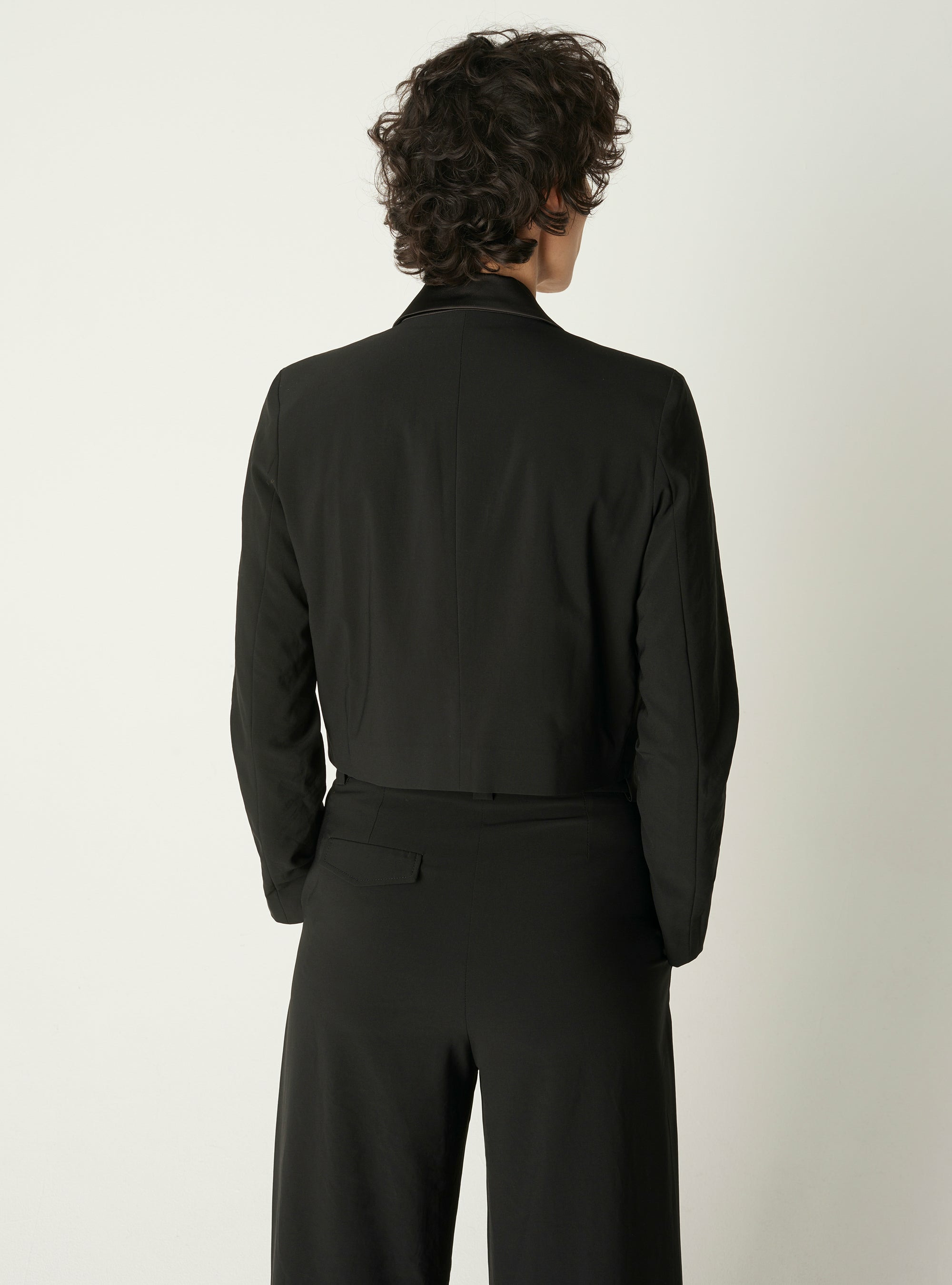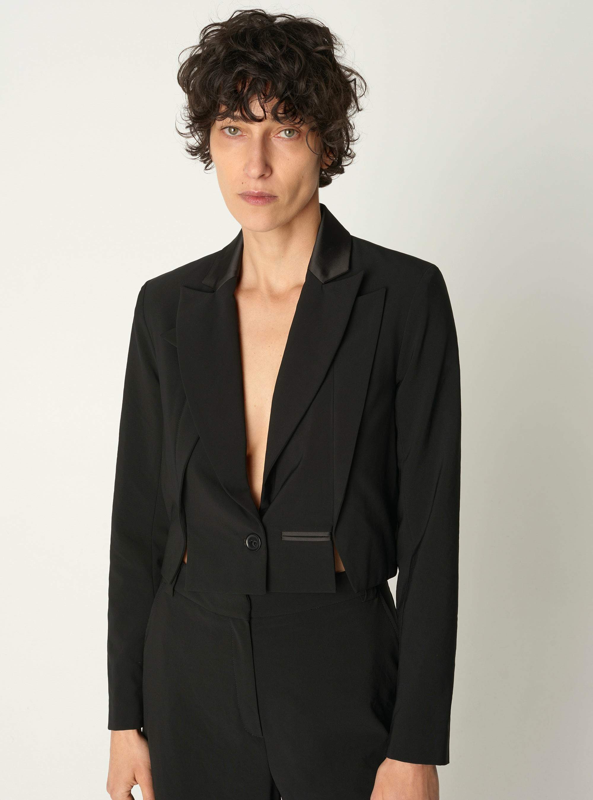 Veste courte encolure plongeante et manches longues avec épaulettes : pour un look esprit blazer revisité. Sa doublure en coton contient l'imprimé exclusif de la saison et ses détails de satin renforcent la silhouette élégante. À porter en total look noir ou dépareillé pour un look plus casual.Marque : Cotélac