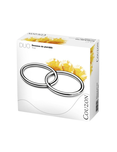 Dessous de plat Duo composé de 2 anneaux en acier 18/10, finition miroir. Un dessous de plat malin et design à utiliser en duo ou en solo selon la taille de votre plat. Un joli cadeau qui évoque les alliances d'un mariage.