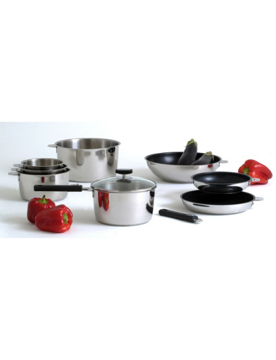 Simple, légère, pratique, la gamme Malice est élaborée en acier inox 18/10 avec finition miroir. Les ustensiles sont à poignée amovible. Le fond sandwich est anti-adhérent, thermo-diffuseur et compatible tous feux, y compris induction. Astucieux, le couvercle s'accroche sur le bord des fûts qui s'empilent s'empilent pour gagner de l'espace.