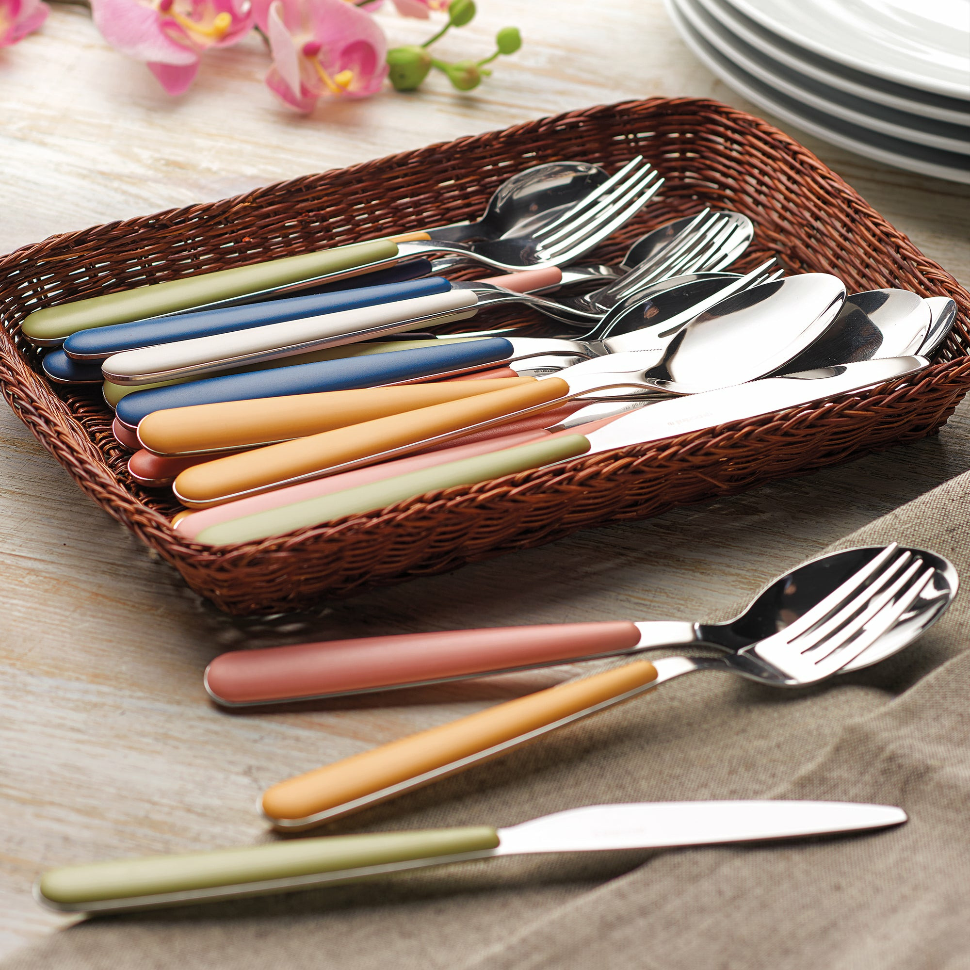 Cette ménagère, composée de 24 couverts colorés (6 fourchettes, 6 couteaux, 6 cuillère de table et 6 cuillères à café), apportera une touche de fraîcheur et de créativité sur la table de tous les jours, en intérieur comme en extérieur.