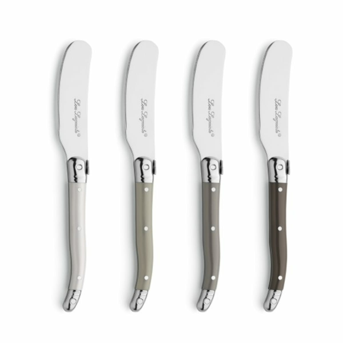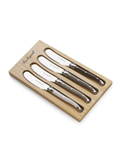 Ensemble de 4 tartineurs Laguiole de la gamme Tradition livré dans un coffret en bois. Manche en polypropylène poivre, perle, taupe et beige, avec deux mitres en acier inox. Lame microdentée en acier trempé.