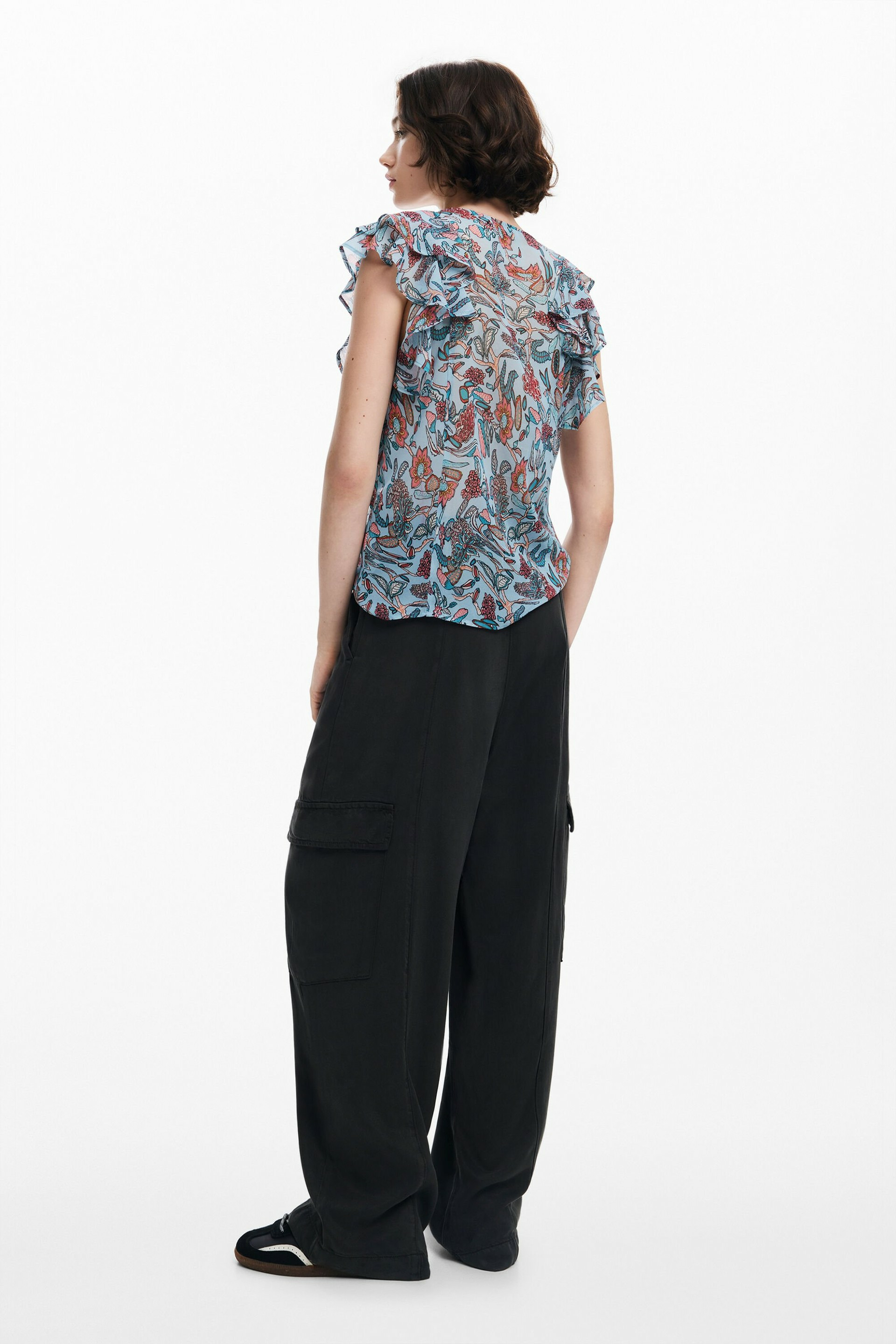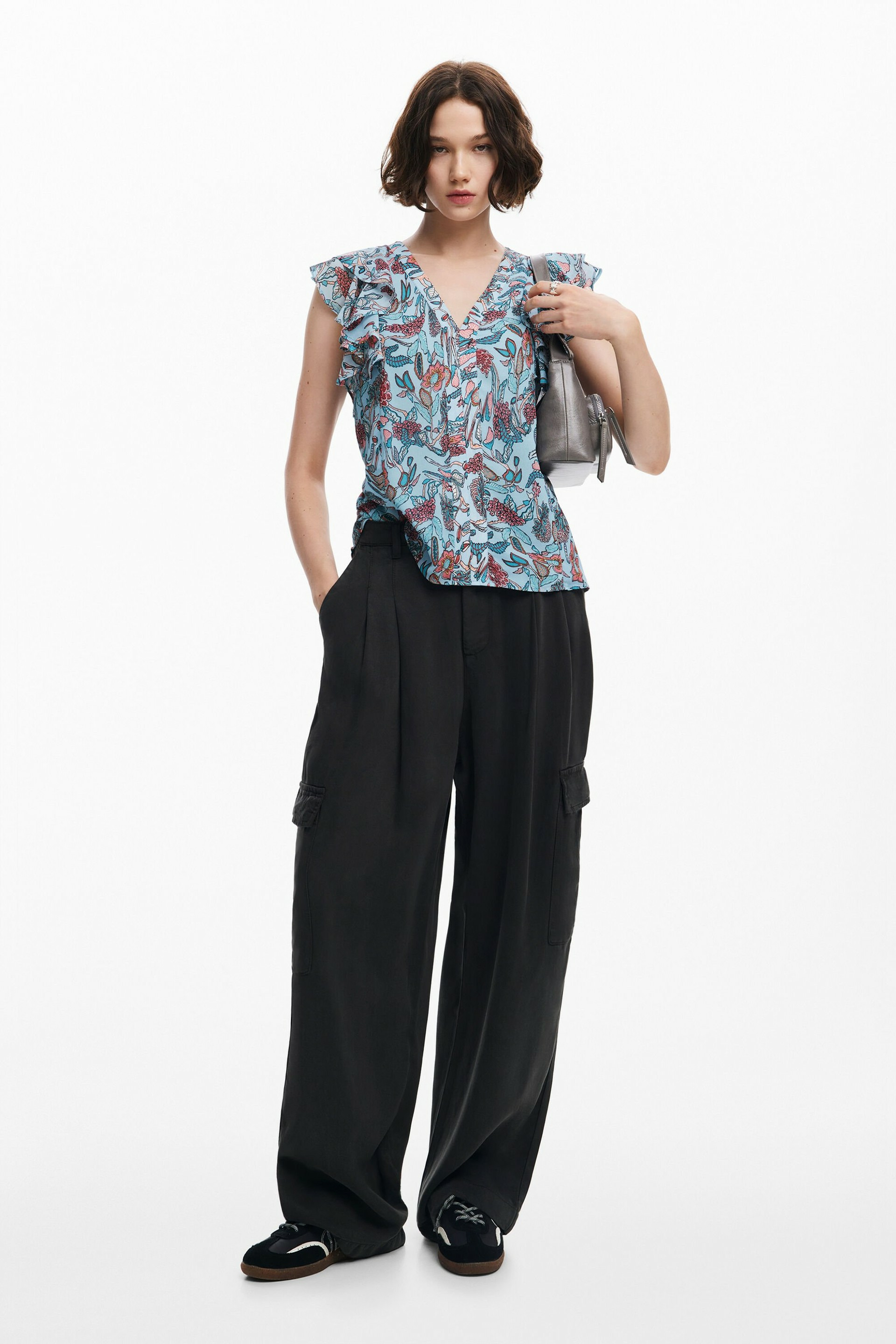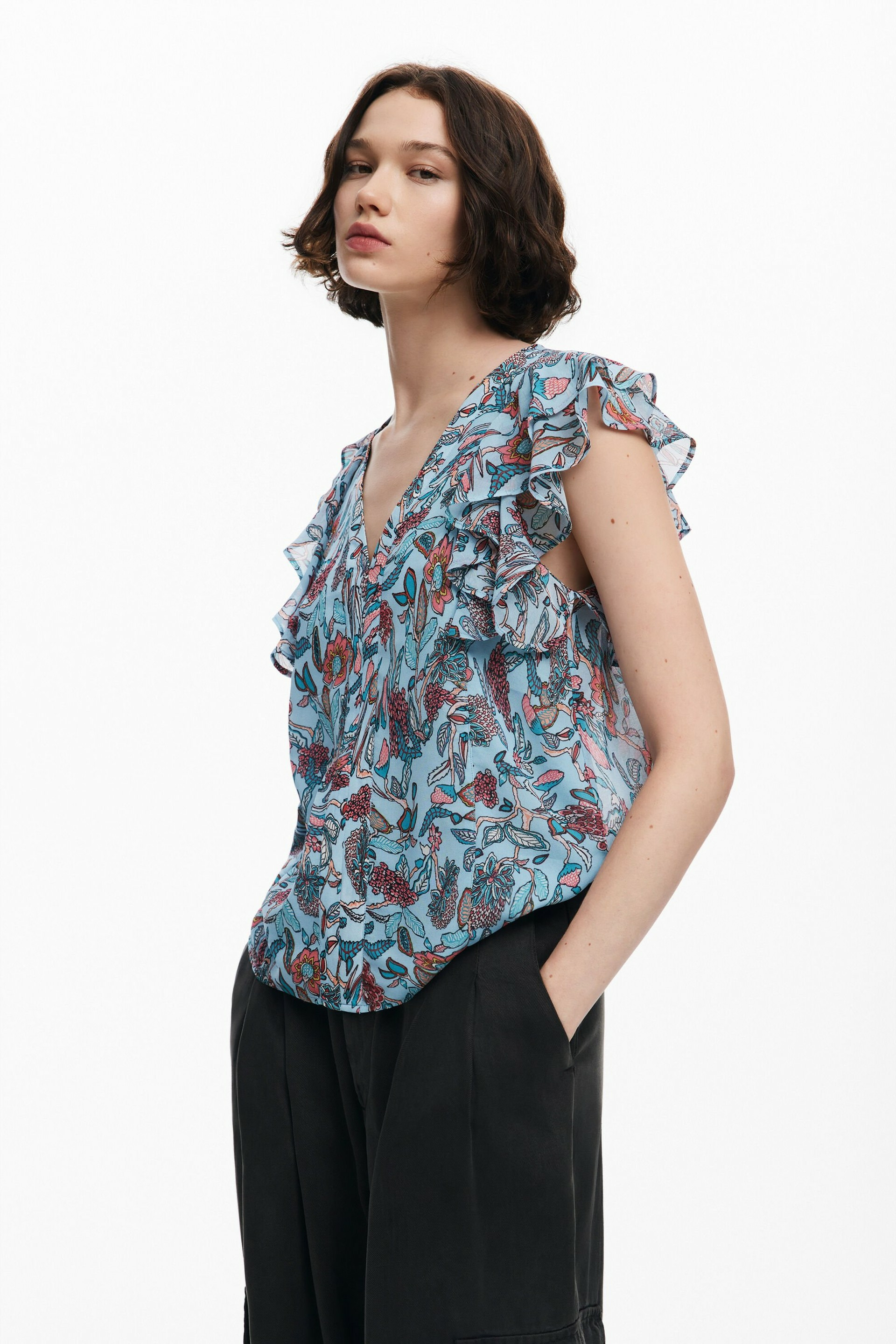 Laissez-vous séduire par cette blouse à manches courtes au col en V, sublimée par un imprimé floral délicat et des volants féminins qui apportent légèreté et mouvement. Une pièce incontournable pour insuffler fraîcheur et élégance à votre garde-robe estivale.