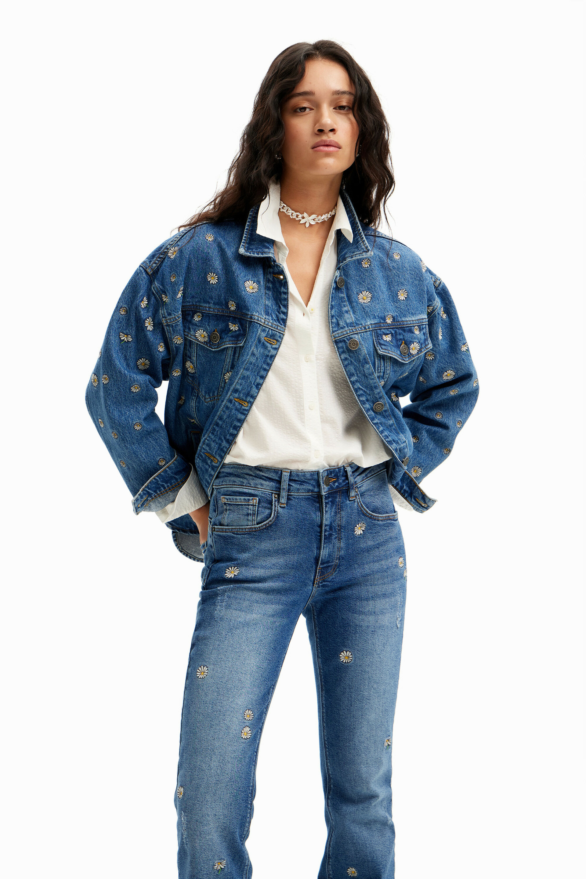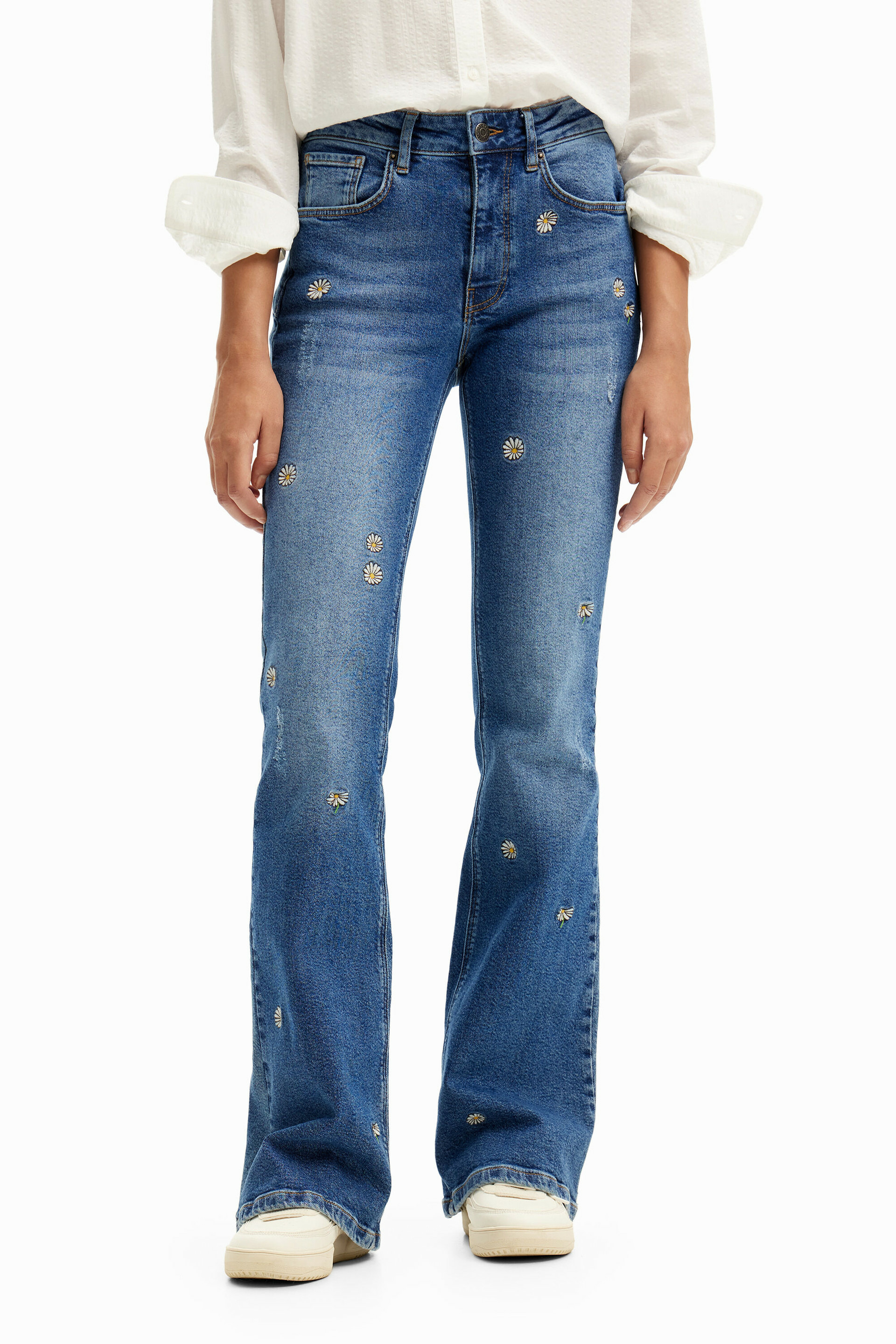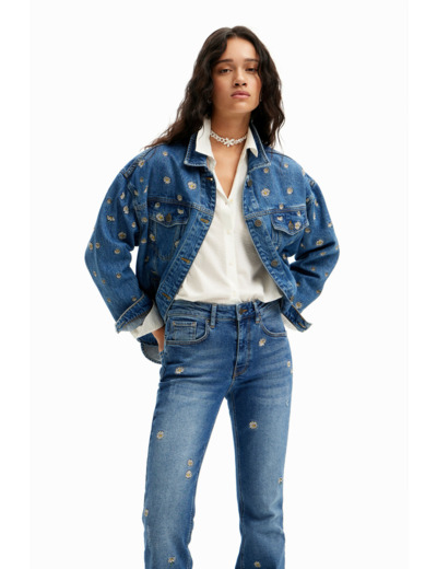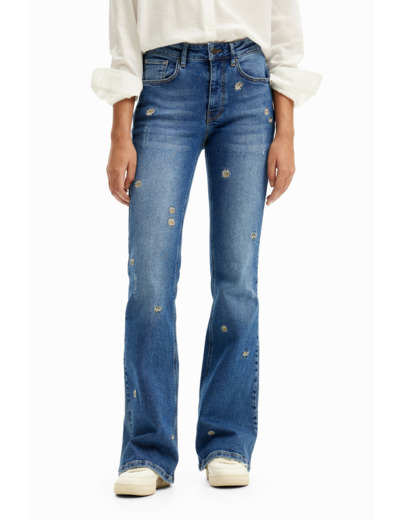 Affirmez votre style avec ce jean évasé push-up bleu orné de fleurs brodées, un essentiel de la nouvelle collection Femme SS24 Desigual. Alliez confort et originalité pour un look unique et tendance.