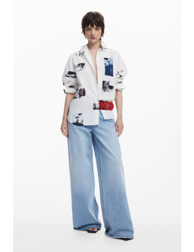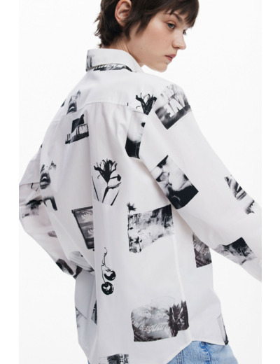 Lavage en machine à l’eau froide, cycle délicat. Chemise manches longues en coton 100%, fond uni avec imprimé collage de photographies. Marque : Desigual.