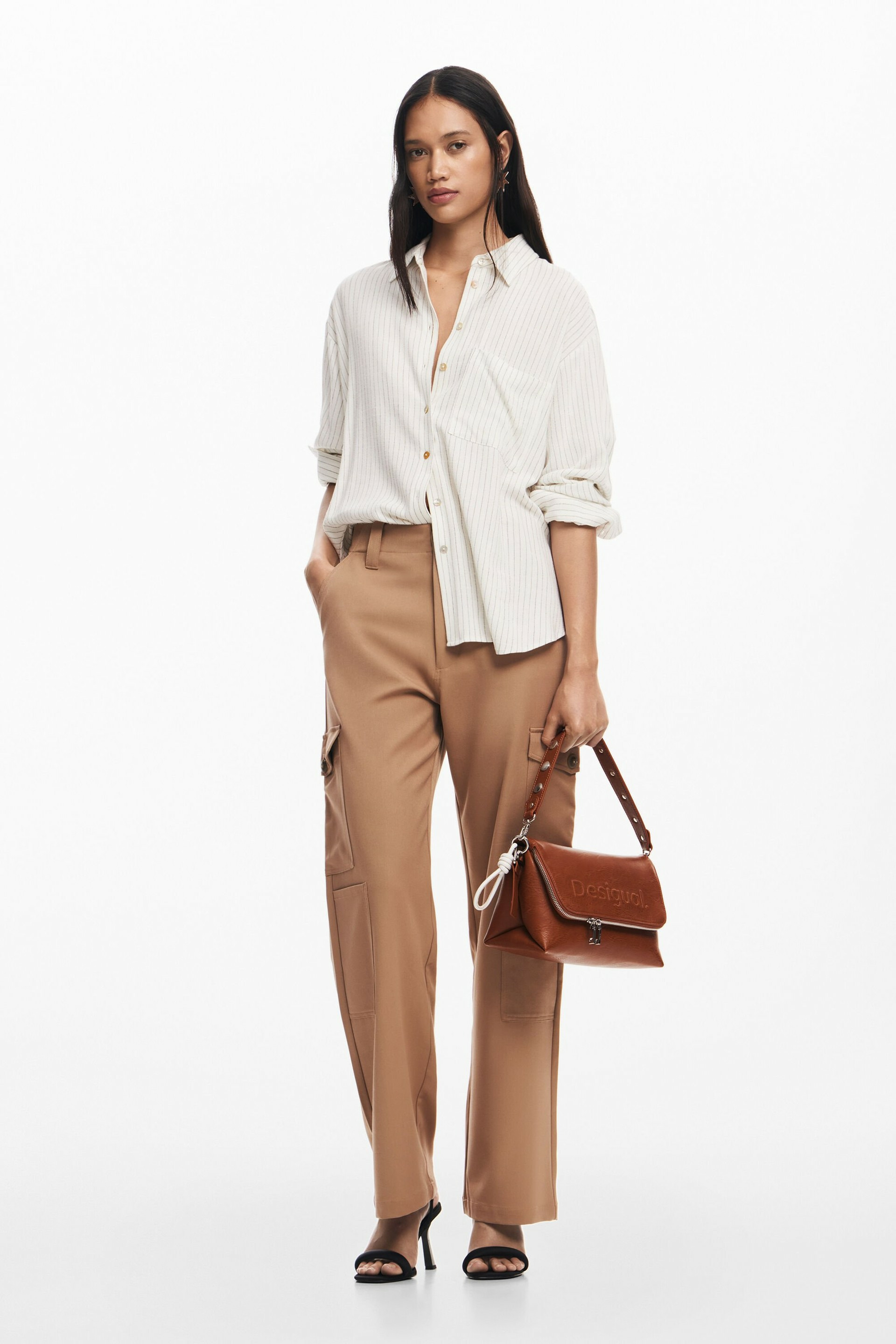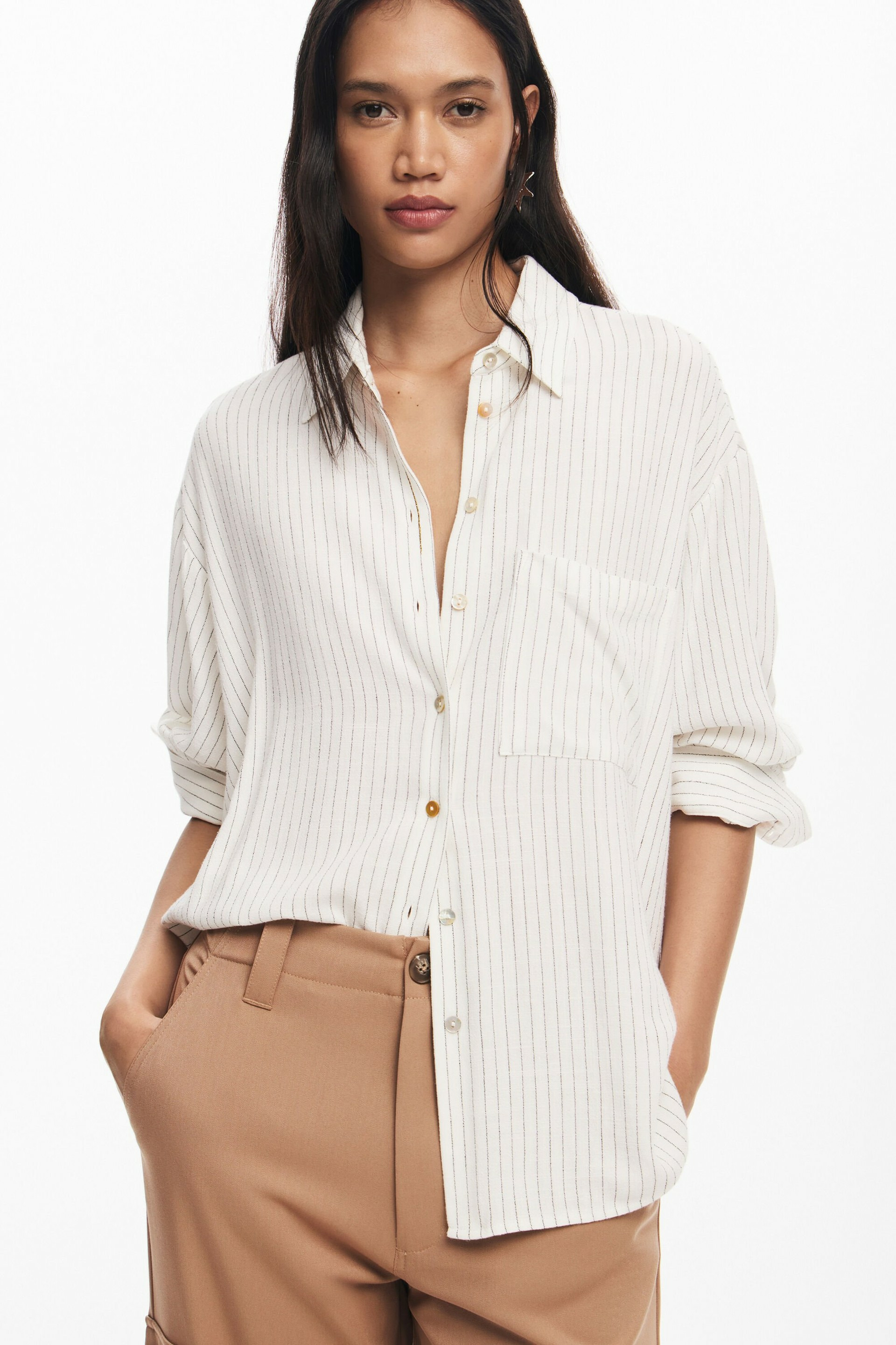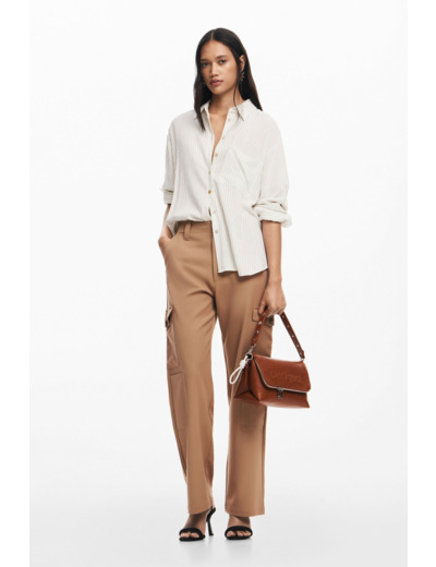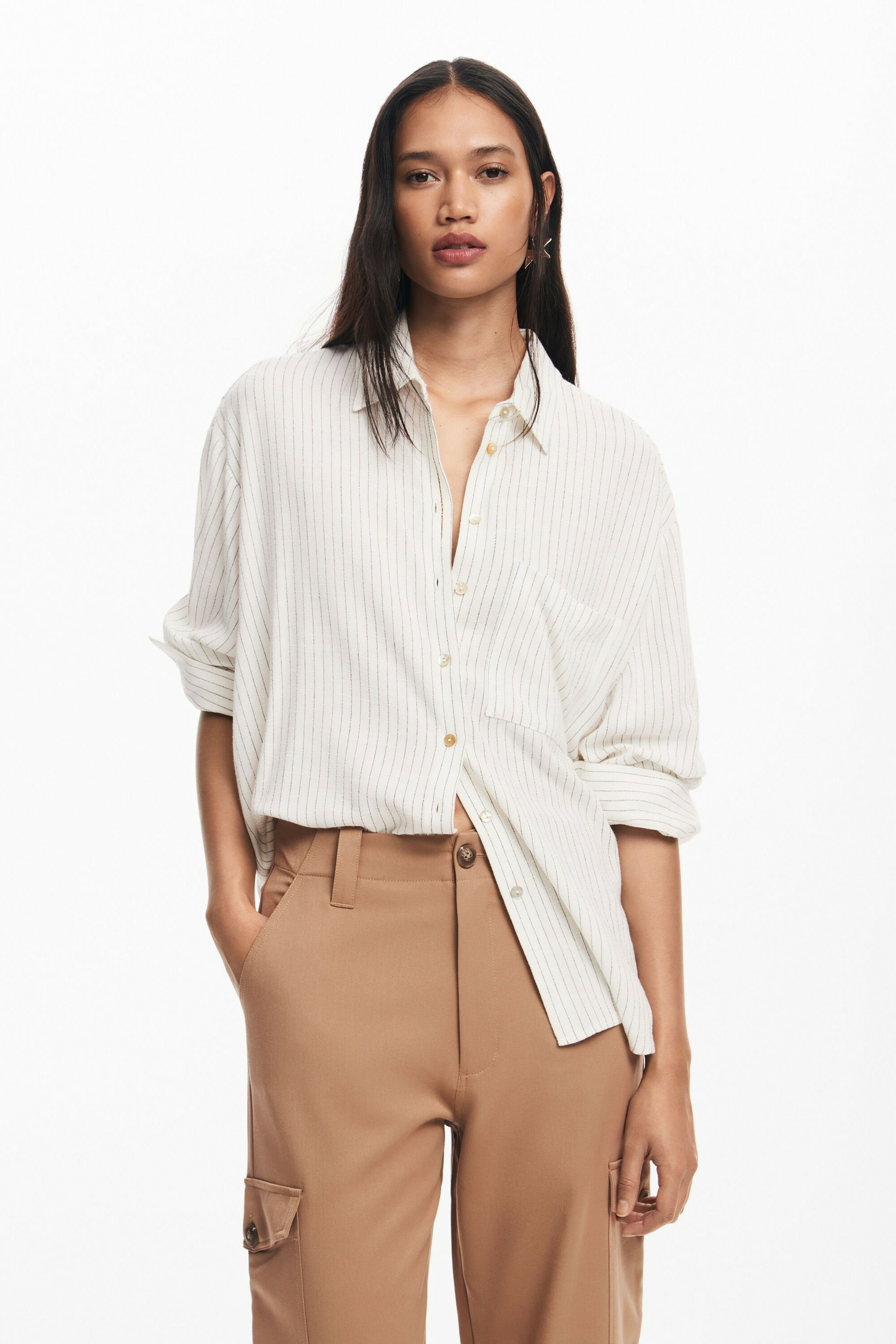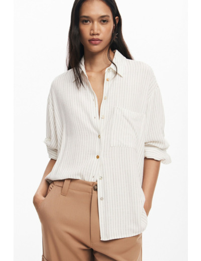 Lavage en machine à l’eau froide, cycle délicat. Chemise à manches longues avec fermeture à boutons. Imprimé rayé avec dessin au dos. Marque Desigual.