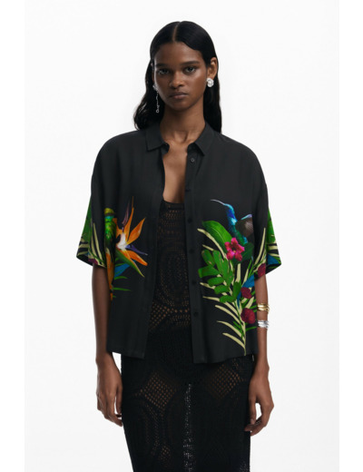 Affichez un style estival affirmé avec cette chemise à manches courtes au fond uni rehaussé de détails floraux hawaïens. Son col classique et sa fermeture à boutons apportent une touche élégante à ce top décontracté.
