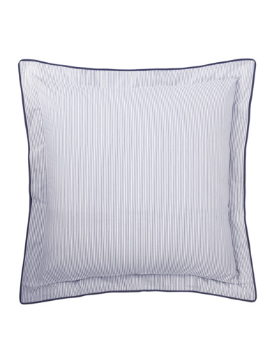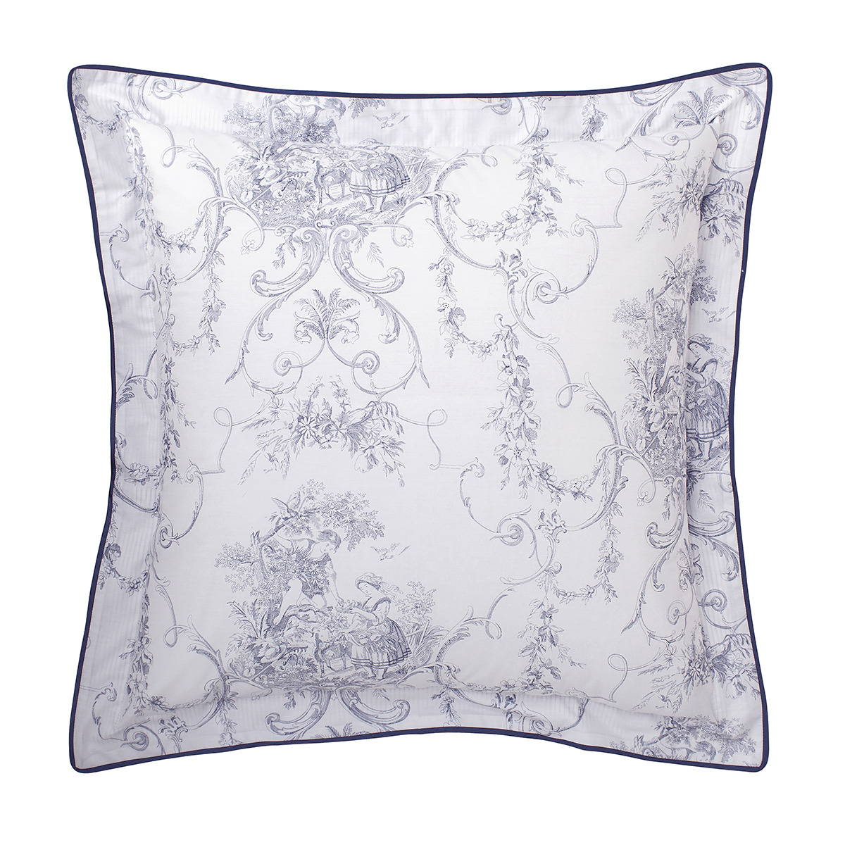 Silhouettes et paysage bucolique à l’écriture raffinée dans des nuances de gris animent la taie d’oreiller Promise. Son revers déploie un jeu de fines rayures verticales grises bleutées.