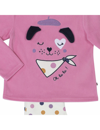 Ce pyjama se compose d’un haut à manches longues où se trouve un joli petit chien super fashion et d’un legging à pois.