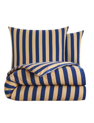 Son motif à rayures larges bleu marine et camel dynamise instantanément la chambre, tout en conservant une élégance sobre et moderne.