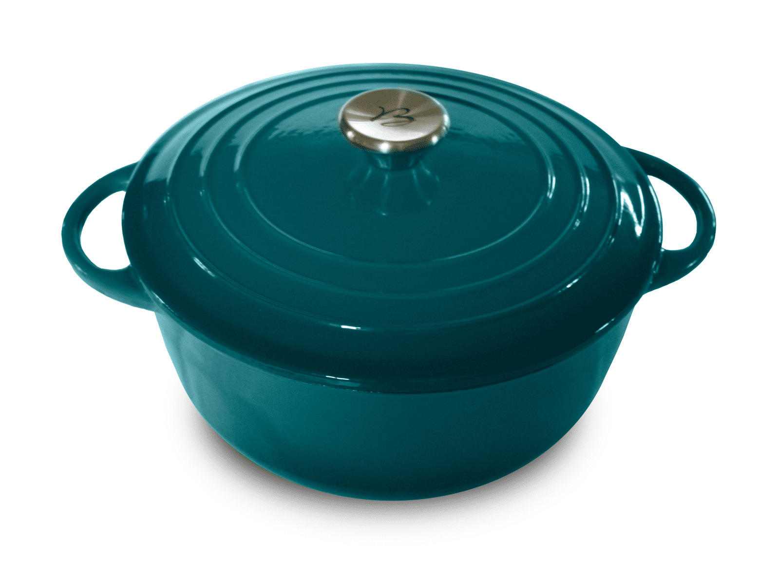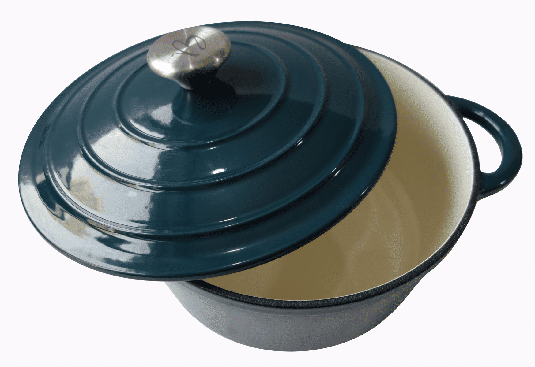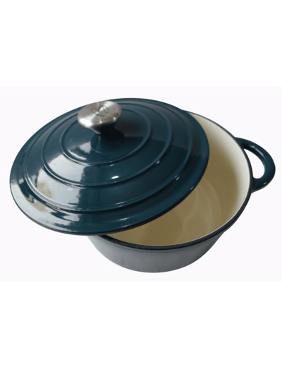 Fonte d'acier émaillée. Intérieur émaillé de couleur crème et extérieur de coloris bleu vert dégradé. Couvercle avec bouton en inox. Compatible tous feux et induction.