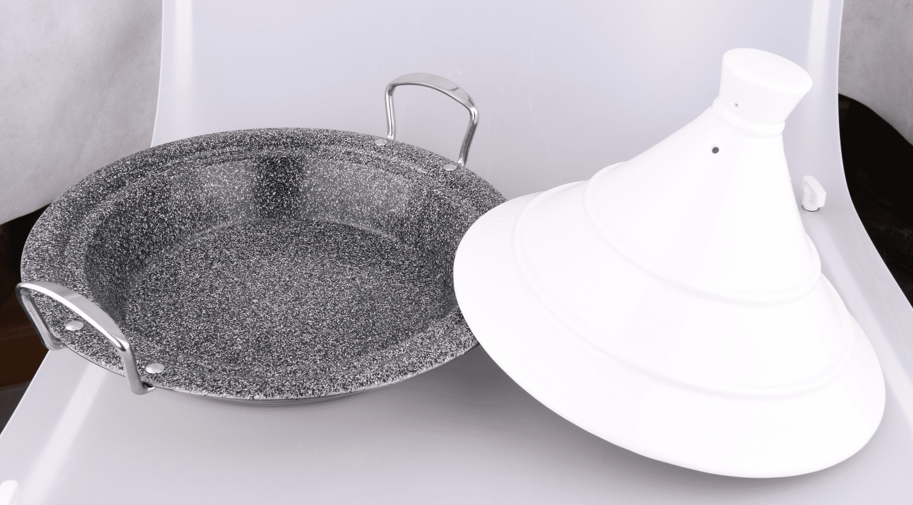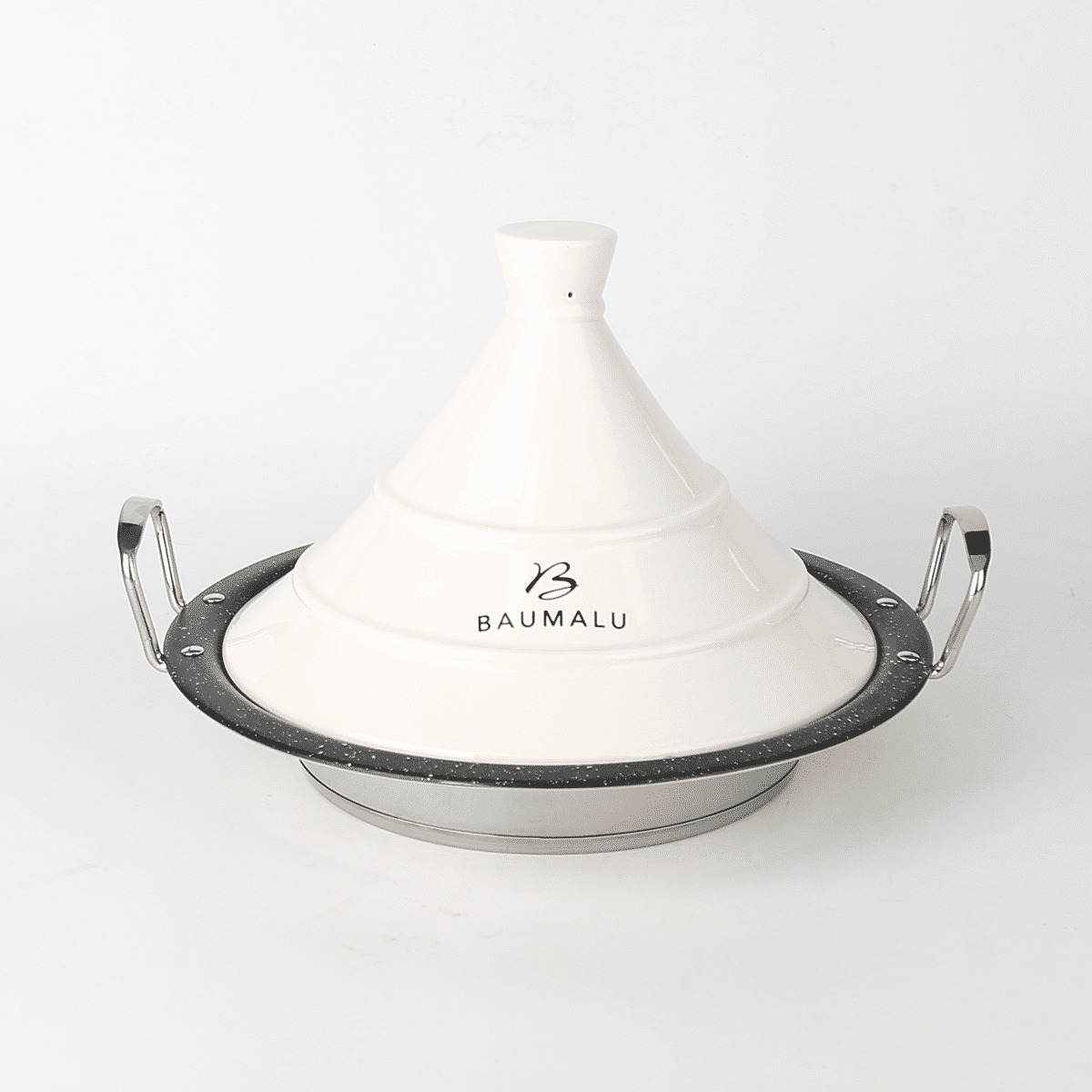 Base en acier inoxydable et couvercle blanc en céramique avec anses en acier inoxydable. Intérieur revêtu avec anti adhérent PPG 2 couches - effet pierre. Tous feux et induction. Four jusqu'à 250 degrés