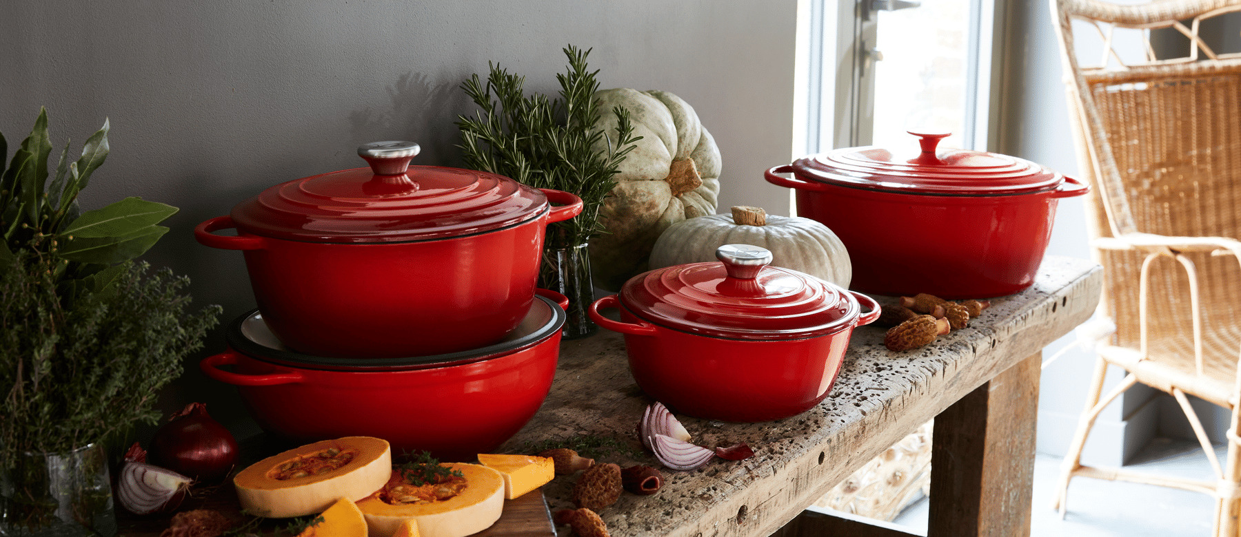 Fonte émaillée. Intérieur émaillé de couleur crème et extérieur de couleur rouge dégradé. Couvercle émaillé de couleur rouge dégradé avec bouton en inox. Compatible tous feux et induction.