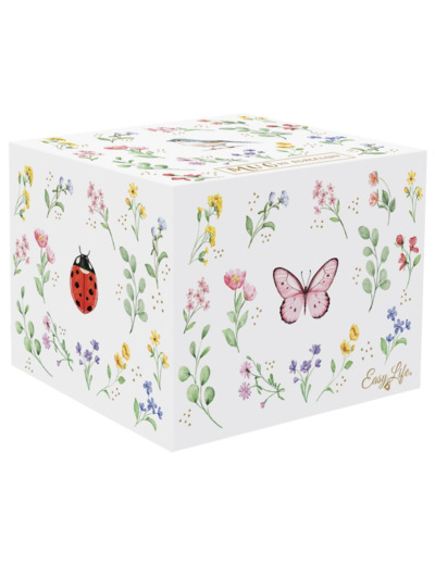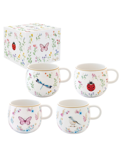 En porcelaine. Mug décliné en 4 décors au choix : coccinelle, papillon, oiseau et libellule. Présentés dans une jolie boite cadeau aux couleurs du décor.