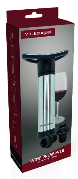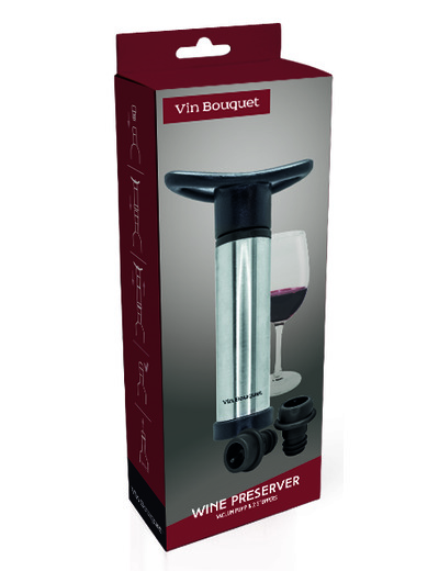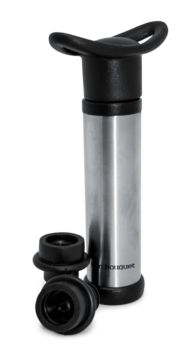 Pompe à vide fournie avec 2 bouchons. Empêche le processus d'oxydation responsable de la détérioration du vin d'une bouteille entamée en créant un vide d'air qui préserve le vin. La poignée de la pompe à vide manuelle est conçue pour faciliter l'action de pompage. En acier inoxydable et ABS.