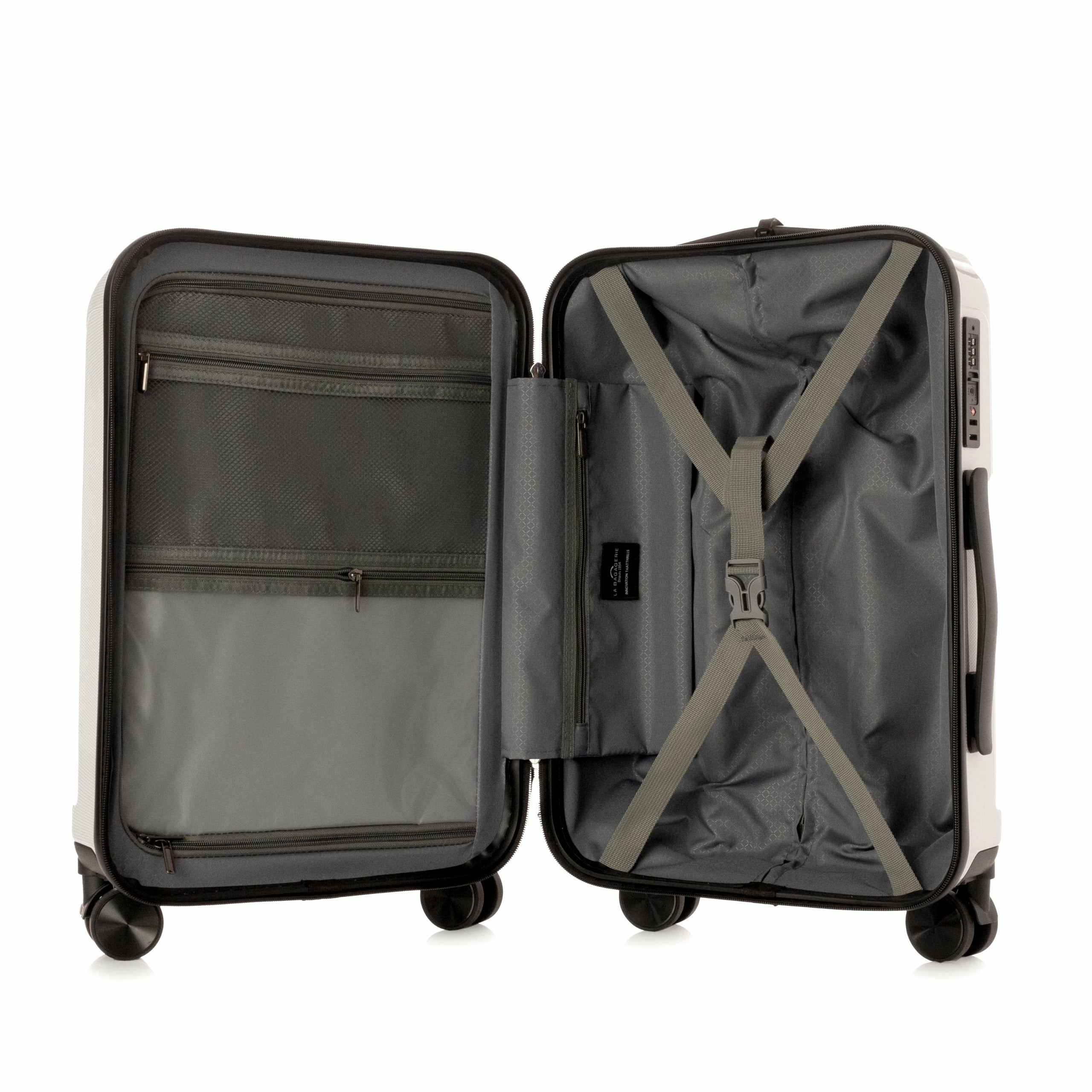 La ligne de valise SUN de la Maison LA BAGAGERIE associe élégance résistance et légèreté grâce à la combinaison de 2 matériaux: Polycarbonate et ABS. Son petit gabarit en fait un bagage de choix pour prendre l'avion. Maniables et pratiques, c'est une alliée de choix pour les départs en week-ends ou une  escapade de moins d'une semaine. La valise SUN possède 2 compartiments pourvus d'une doublure textile et d'un plateau séparateur souple zippé. Elle permet ainsi un chargement simple et rapidement des tenues de rechange, des affaires de toilette. Elle se faufile partout avec ses 4 doubles roues multidirectionnelles et sa poignée télescopique. Sa poignée haute facilite sa prise en main pour la déposer  dans le coffre d'un véhicule. Pour une sécurisation optimale, on peut compter sur sa serrure TSA à code et sa solide fermeture zippée._x000D_