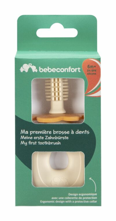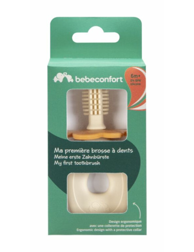 Ma première brosse à dent BEBE CONFORT une introduction au brossage inépendant. Conçue avec des poils en silicone pour un nettoyage en douceur des gencives et des premières dents. Design ergonomique. Collier de protection.