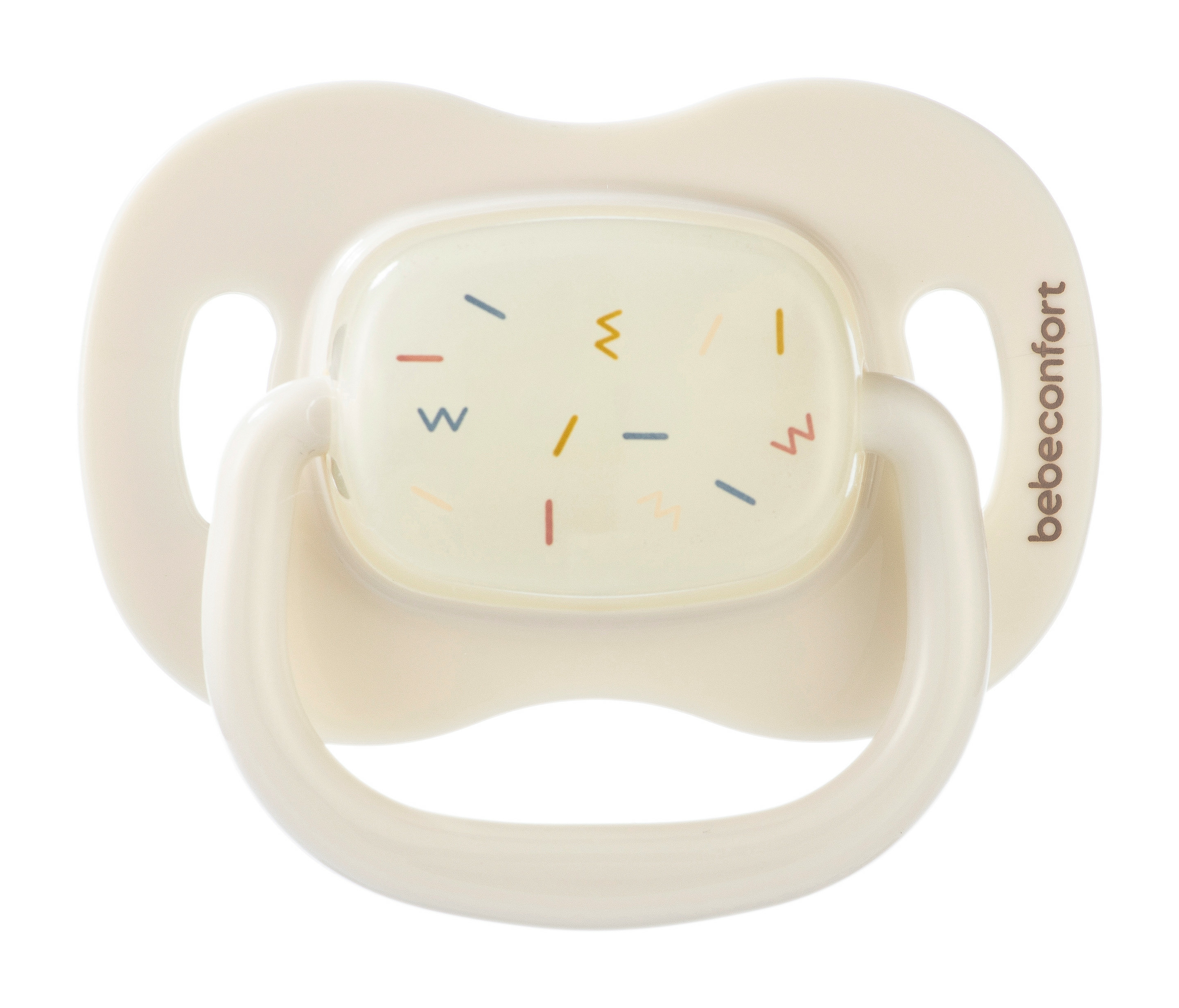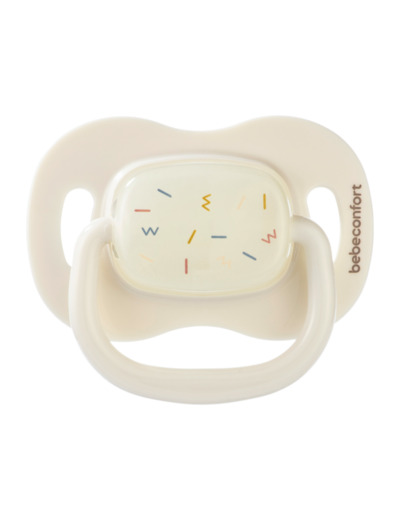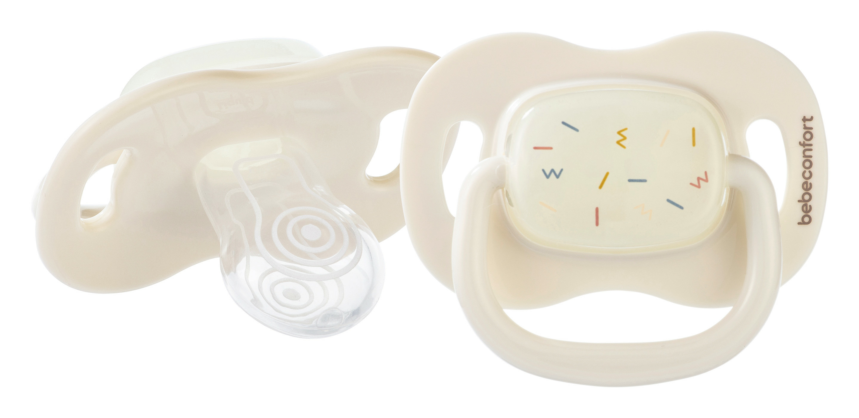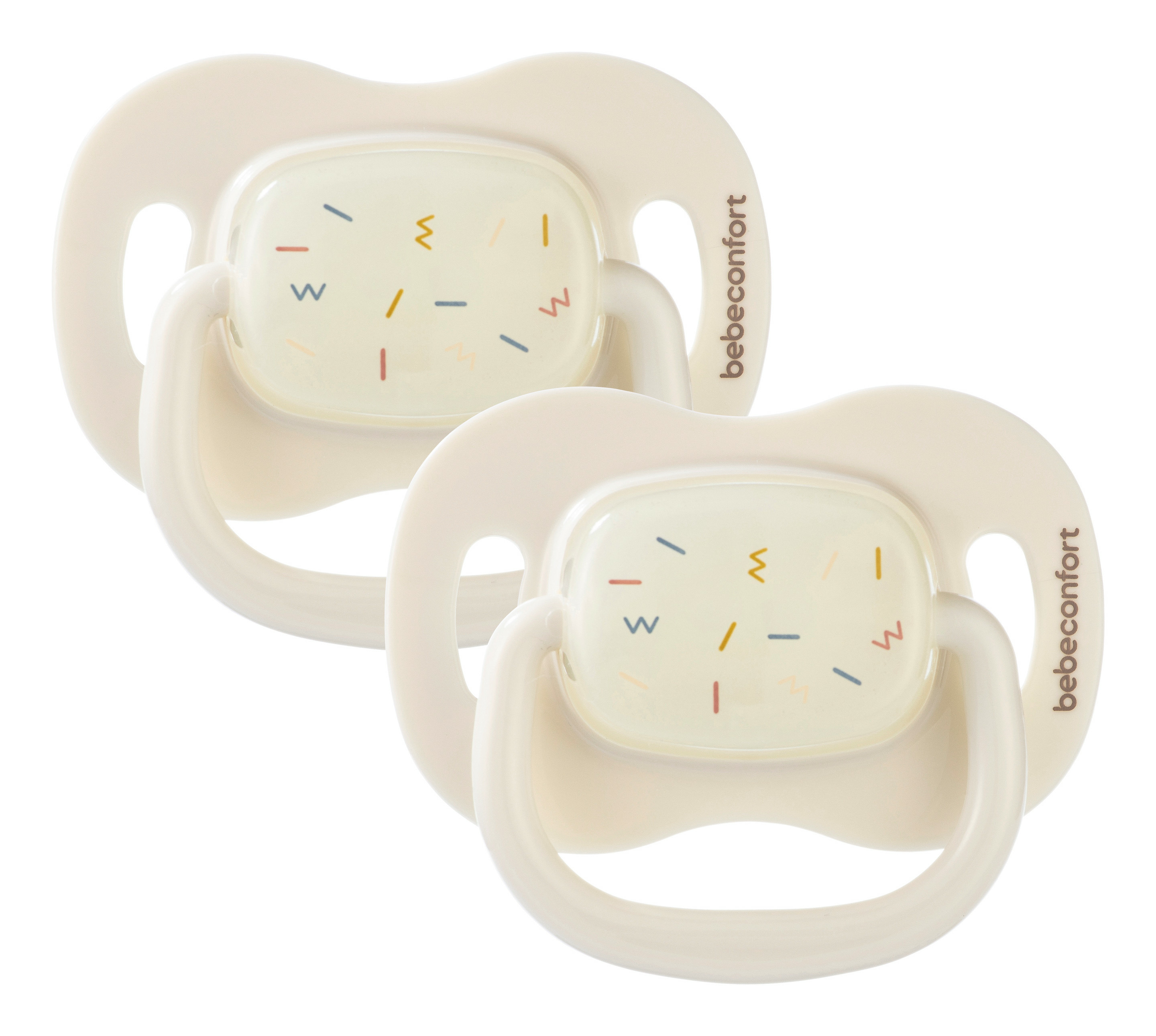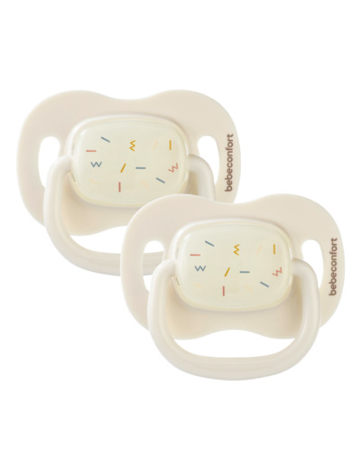 Lot de 2 sucettes reversible silicone phosphorescente 6/36 mois. Brille dans le noir. Toujours dans le bon sens avec des bords doux et confortables. Téterelle symétrique en silicone positionnée correctement quel que soit le sens.