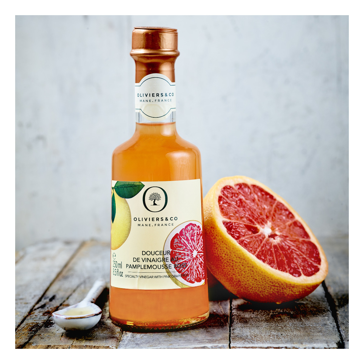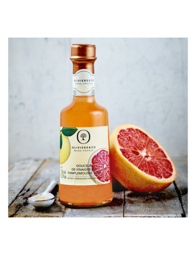Oliviers&Co vous présente en exclusivité sa nouvelle création : la douceur de vinaigre au pamplemousse rose, un véritable hommage à ce fruit emblématique de la Méditerranée. Élaborée à partir des meilleurs pamplemousses roses, cueillis à pleine maturité, cette douceur de vinaigre offre au palais une fraîcheur incomparable et arbore une couleur éclatante. Sans arômes ni sucres ajoutés.