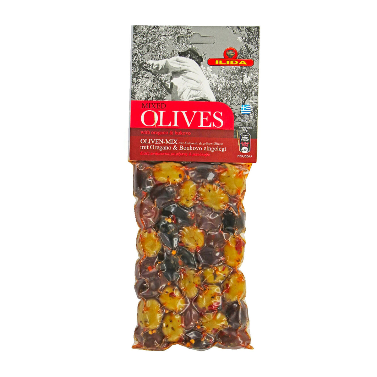 Origine: Produit de Grèce. Ingrédients: olives noires Kalamata & olives vertes 94%, huile dʼolive, vinaigre, origan 0,6%,poivron rouge bukovo 0,4%, sel. Conditions particulières de conservation: Produit sous vide, à conserver au frais après ouverture & consommer sous 5 jours