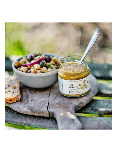 Origine: Produit de FranceIngrédients : Pois chiche** 51%, huile d’olive, bouillon aromatique (eau, oignon, céleri, poireau, échalote, épices), jus de citron, sésame* 5%, sel, ail, piment d’Espelette, Za’atar (sumac, origan, sésame)Conditions particulières de conservation : Produit pasteurisé, à conserver au frais après ouverture & à consommer rapidement