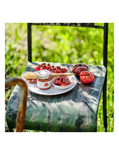 Origine: Produit de France Ingrédients:Tomate séchée* 50% (tomate séchée, eau, sel), tomate (tomate, acidifiant : acide citrique), huile de colza, ail, jus de citron concentré, poivre, piment d’Espelette 0,1%. Conditions particulières de conservation: Produit pasteurisé, à conserver au frais après ouverture & consommer rapidement